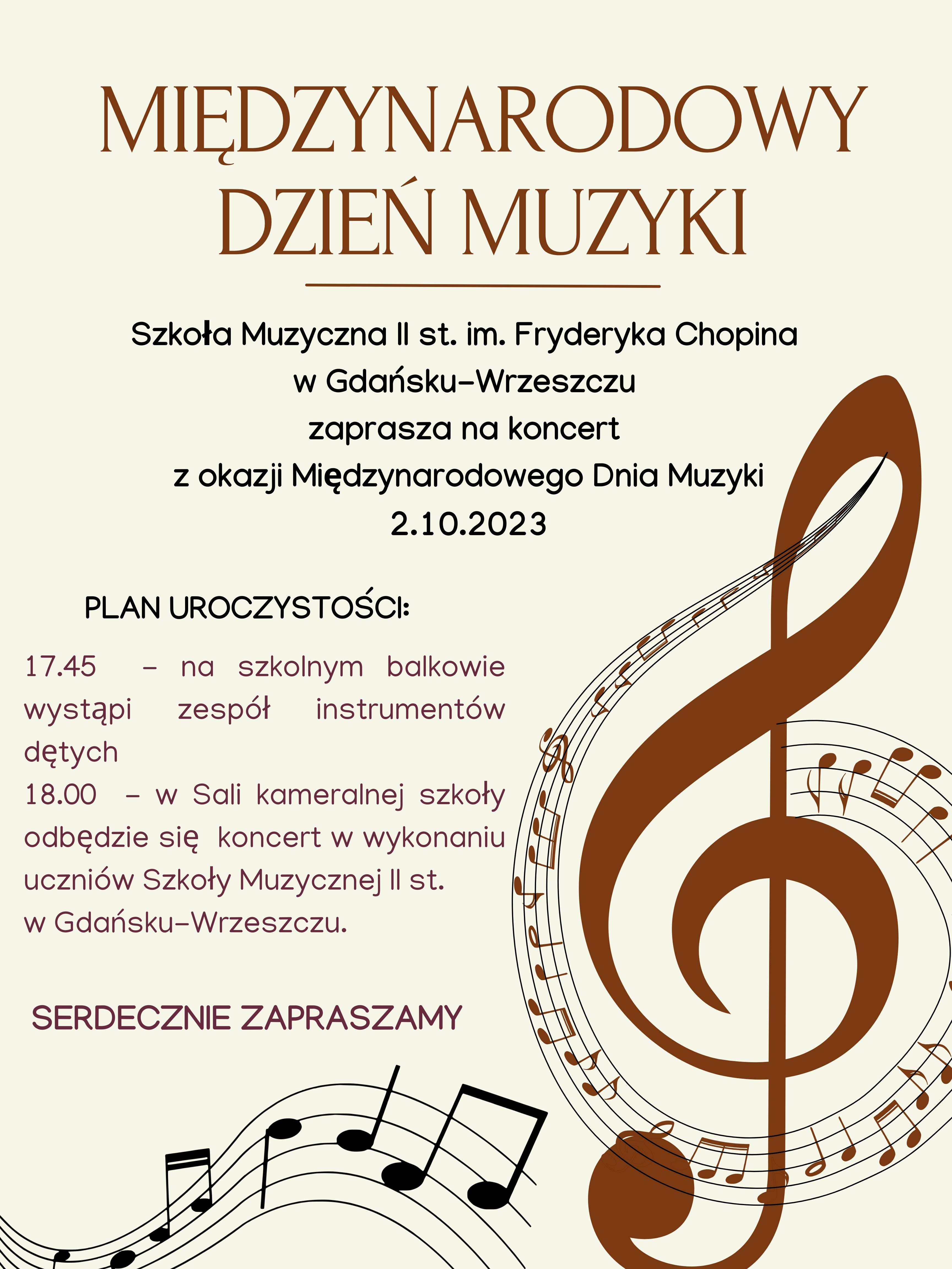 Z okazji Międzynarodowego Dnia Muzyki Szkoła Muzyczna II st. zaprasza na koncert, który odbędzie się 2 października w Sali Kameralnej szkoły.