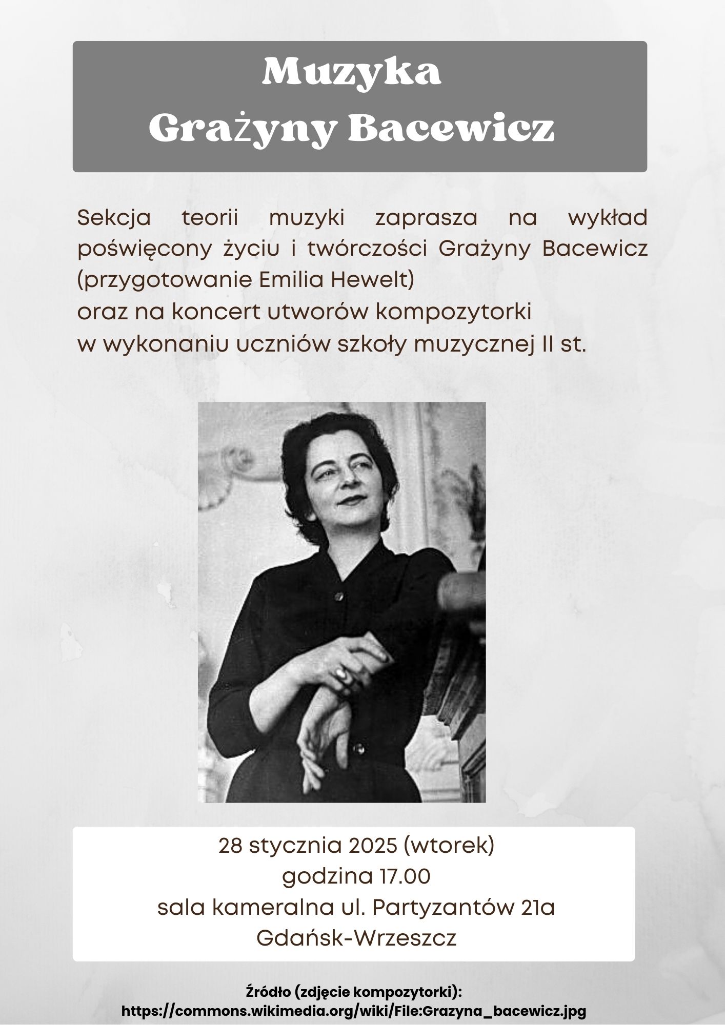 Serdecznie zapraszamy na wykład i koncert poświęcony kompozytorce Grażynie Bacewicz.