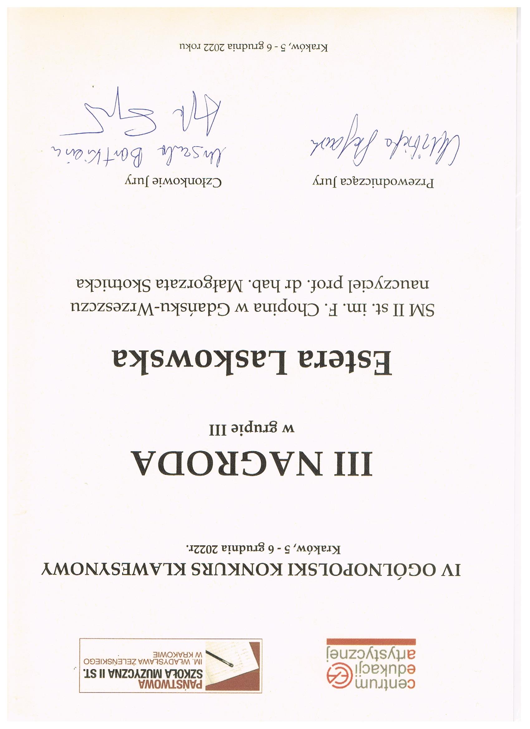 III Nagroda Estera Laskowska, z klasy prof.Małgorzaty Skotnickiej