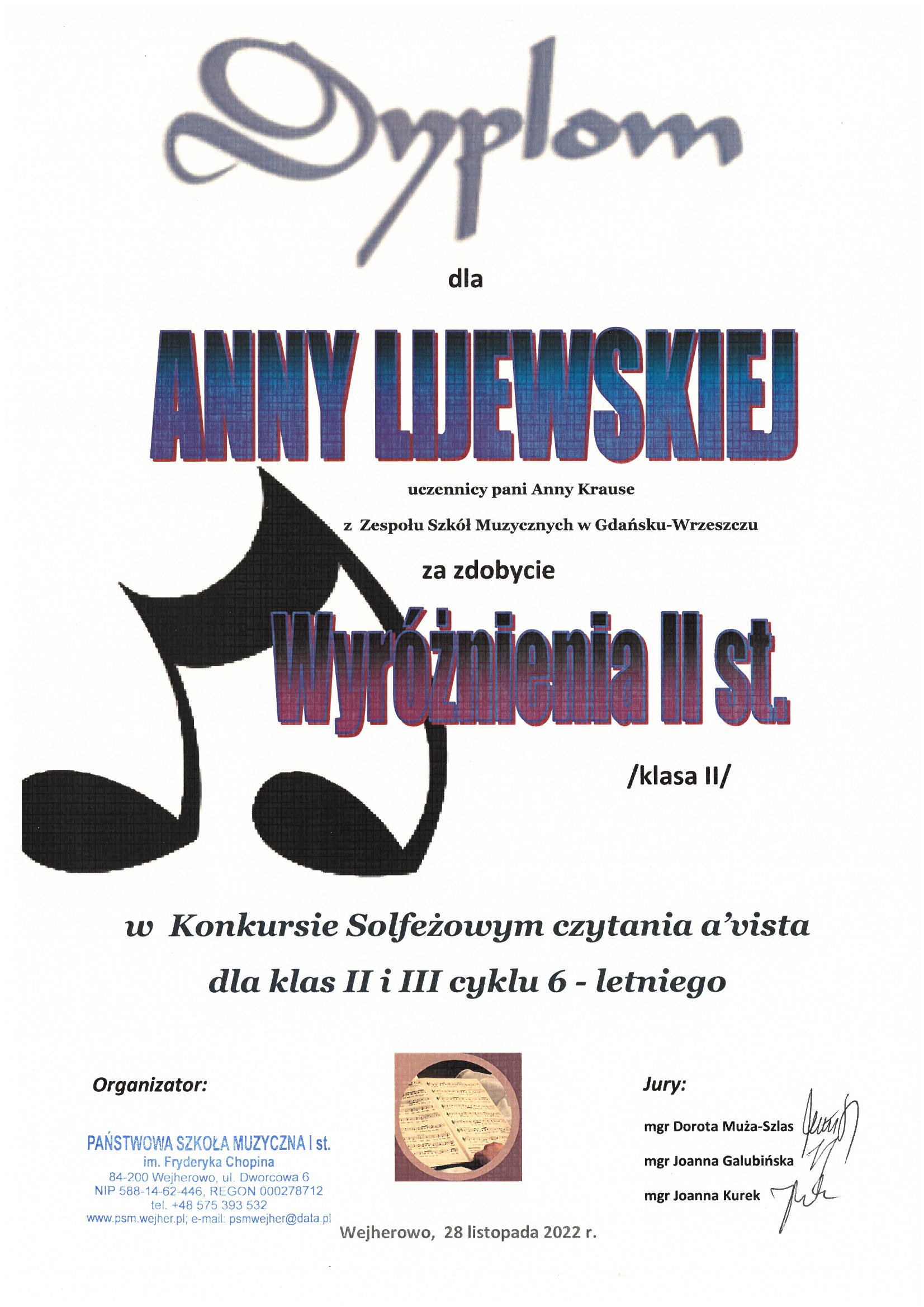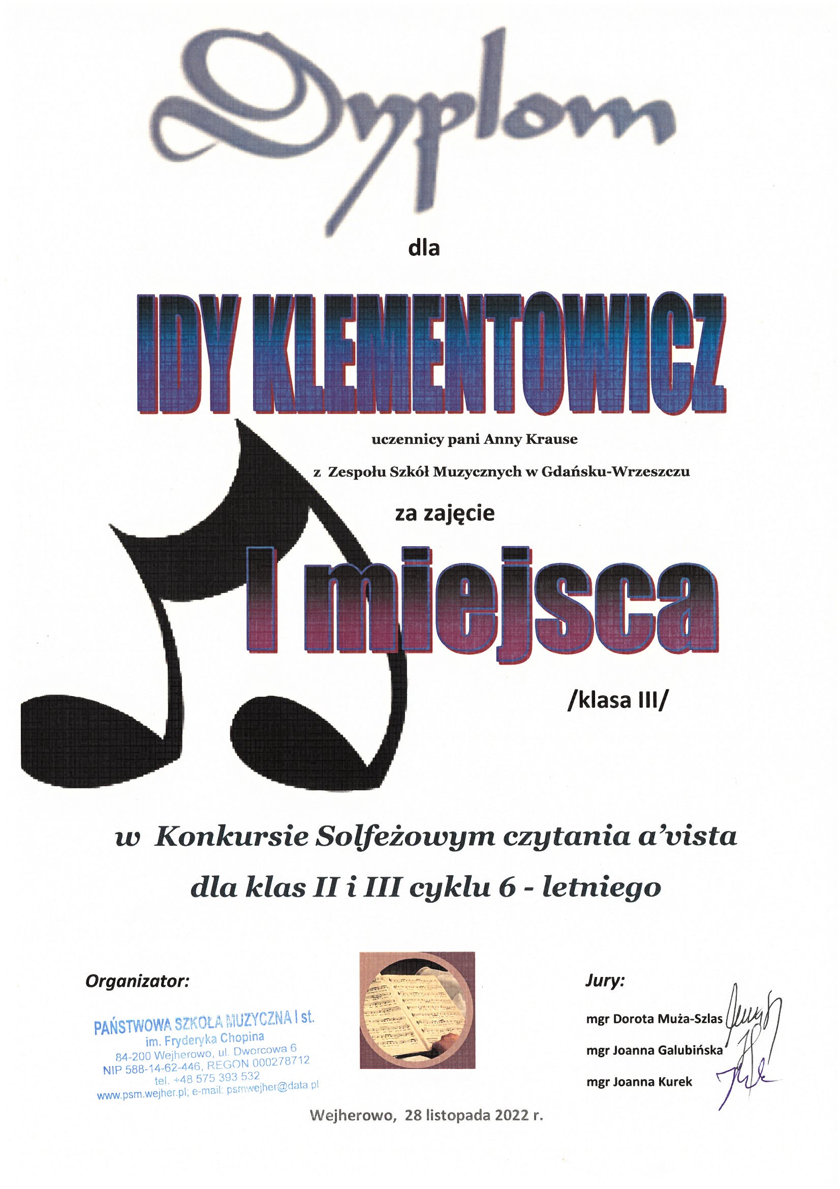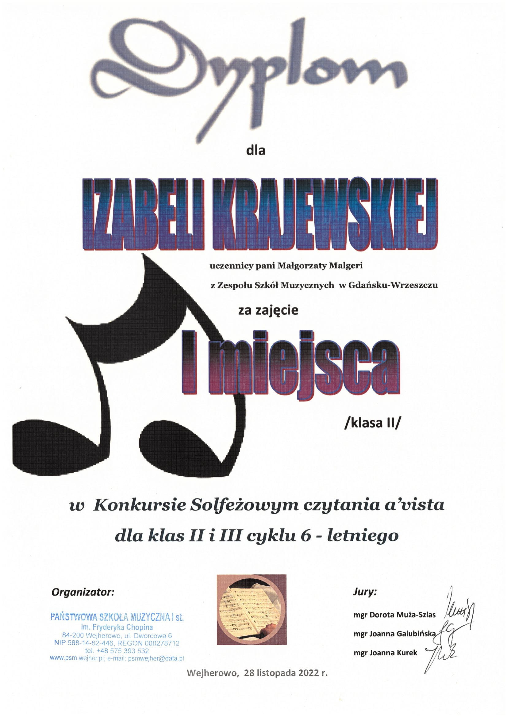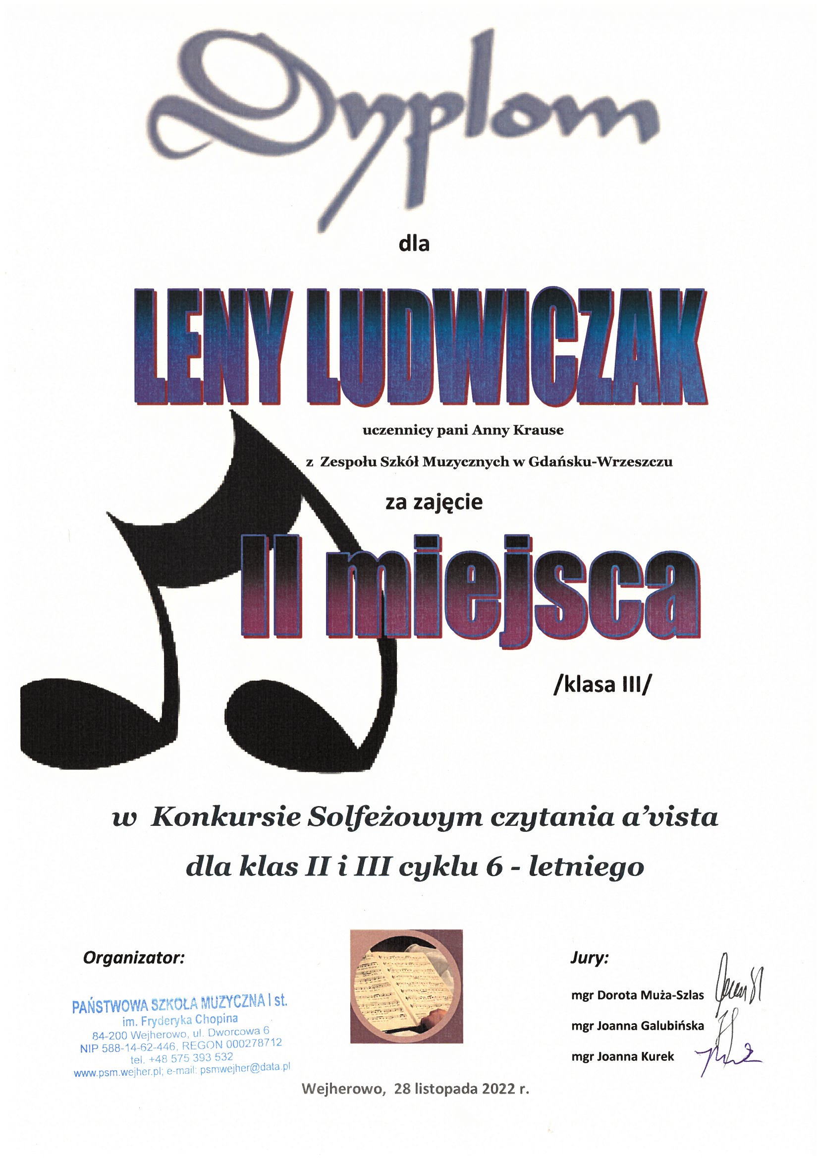28 listopada bieżącego roku w Wejherowie odbył się Konkurs Solfeżowy czytania nut a” vista dla klas 2 i 3 cyklu sześcioletniego.
