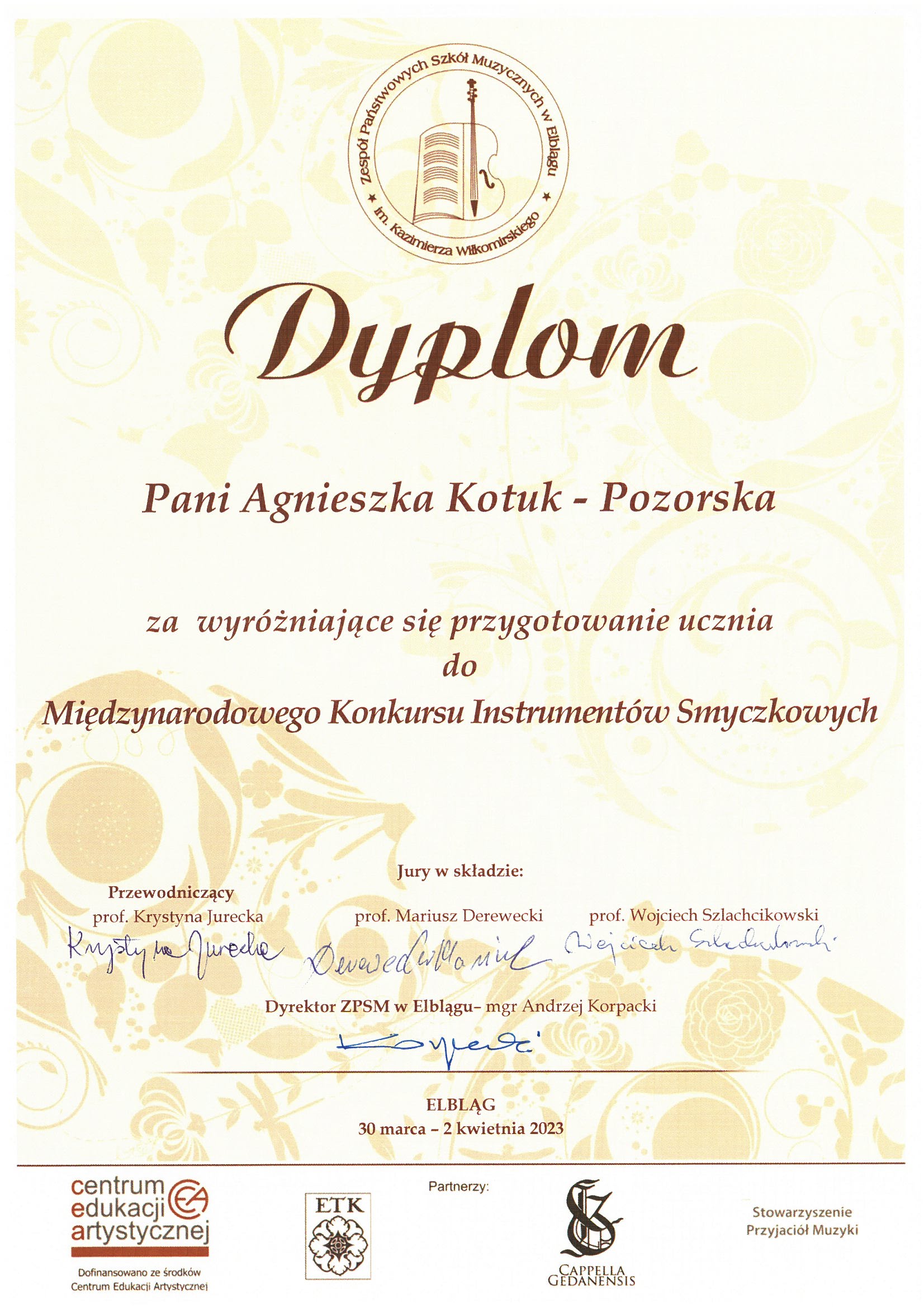 Agnieszka Kotuk-Pozorska - Dyplom za wyróżniające się przygotowanie ucznia