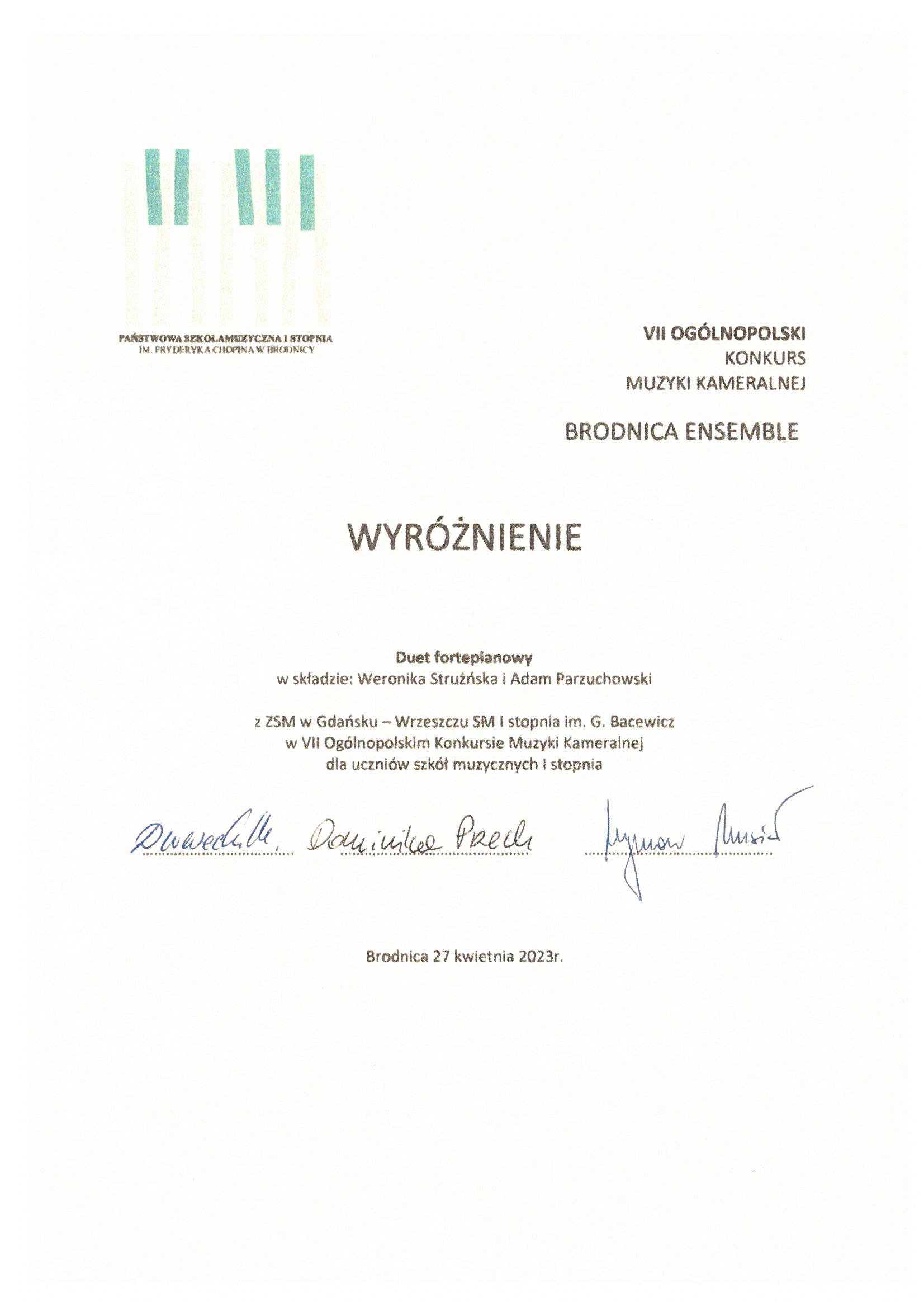 Wyróżnienie dla Duetu fortepianowego w składzie: