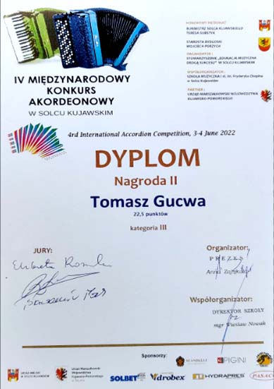W VI Miedzynarodwym Konkursie Akordeonowym w Solcu Kujawskim (4-5.06.2022) uczeń SM II st. Tomasz Gucwa z klasy akordeonu mgr Pawła Pińskiego zdobył II nagrodę w III kategorii.