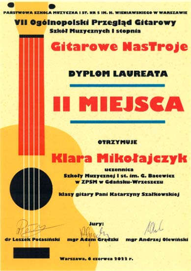 W VII Ogólnopolskim Przeglądzie Gitarowym Szkół Muzycznych I stopnia w Warszawie (6.06.2022) uczennica SM I st. Klara Mikołajczyk z klasy gitary mgr Katarzyny Szałkowskiej została laureatką, zajmując II miejsce.