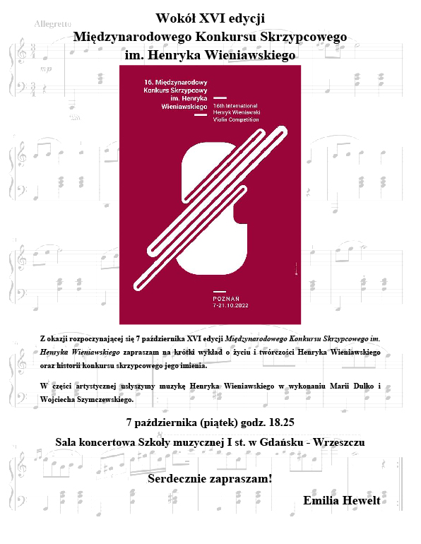 Z okazji rozpoczynającej się 7 października XVI edycji Międzynarodowego Konkursu Skrzypcowego im. Henryka Wieniawskiego zapraszam na krótki wykład o życiu i twórczości Henryka Wieniawskiego oraz historii konkursu skrzypcowego jego imienia. W części artystycznej usłyszymy muzykę Henryka Wieniawskiego w wykonaniu Marii Dulko i Wojciecha Szymczewskiego. 7 października (piątek) godz. 18.25 Sala koncertowa Szkoły muzycznej I st. w Gdańsku – Wrzeszczu