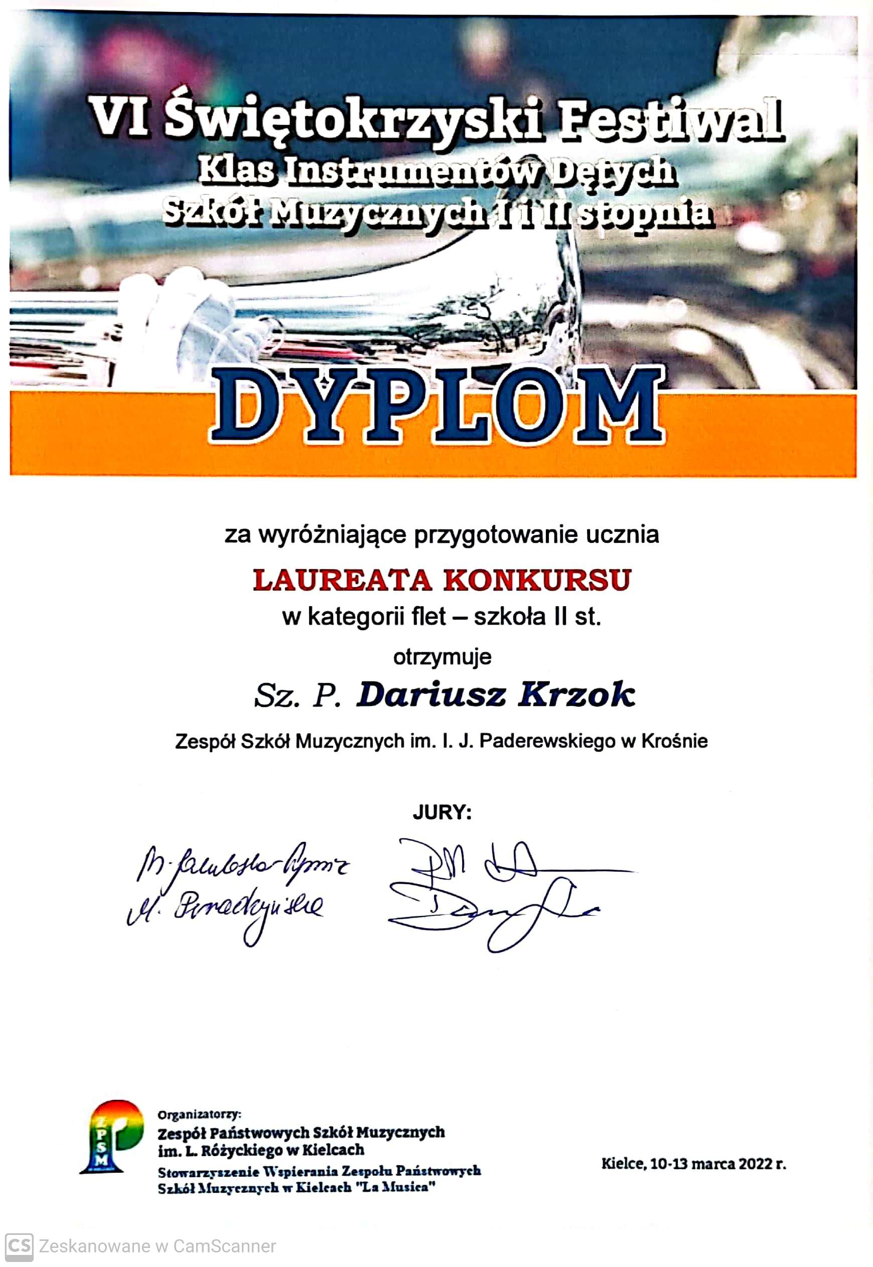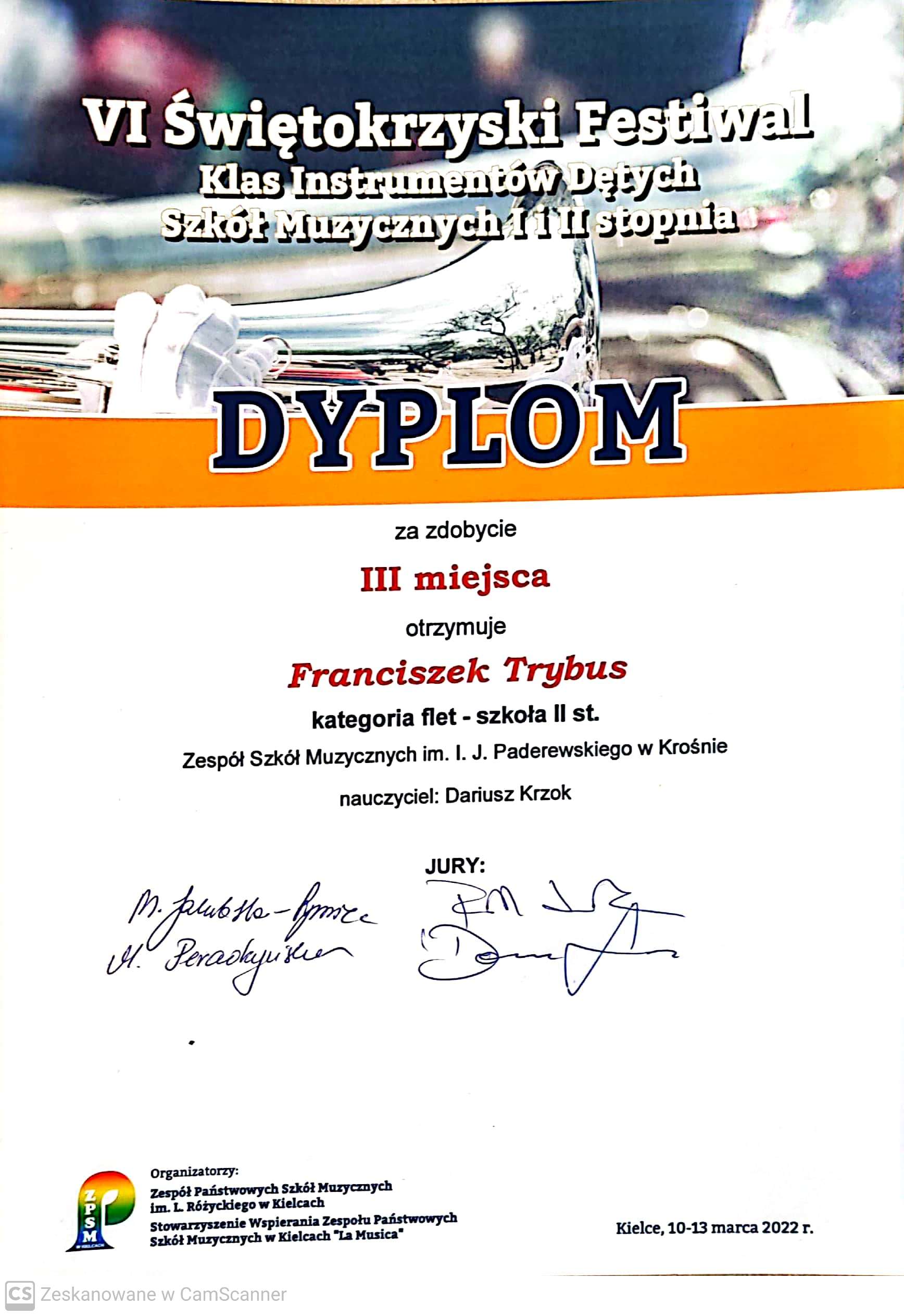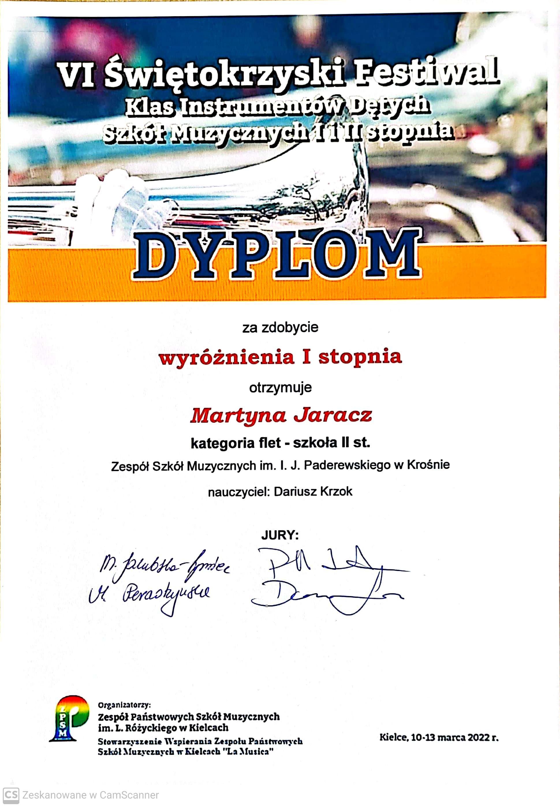VI Świętokrzyski Festiwal Instrumentów Dętych Szkół Muzycznych I i II stopnia to jeden z bardziej prestiżowych tego typu konkursów w Polsce. W tegorocznej edycji wzięło udział ok. 230 wykonawców. Nie zabrakło wśród nich również reprezentantów naszej szkoły, a byli nimi między innymi fleciści z klasy Dariusza Krzoka - Franciszek Trybus, który otrzymał III miejsce oraz Martyna Jaracz, której przyznano wyróżnienie I stopnia.