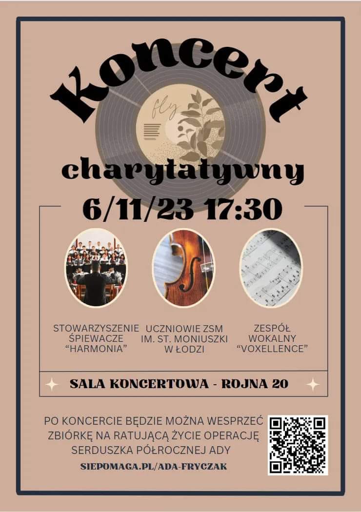 Serdecznie zapraszamy na koncert charytatywny, który odbędzie się 6 listopada 2023 r. w Sali Koncertowej w Zespole Szkół Muzycznych im. Stanisława Moniuszki w Łodzi o godzinie 17:30.