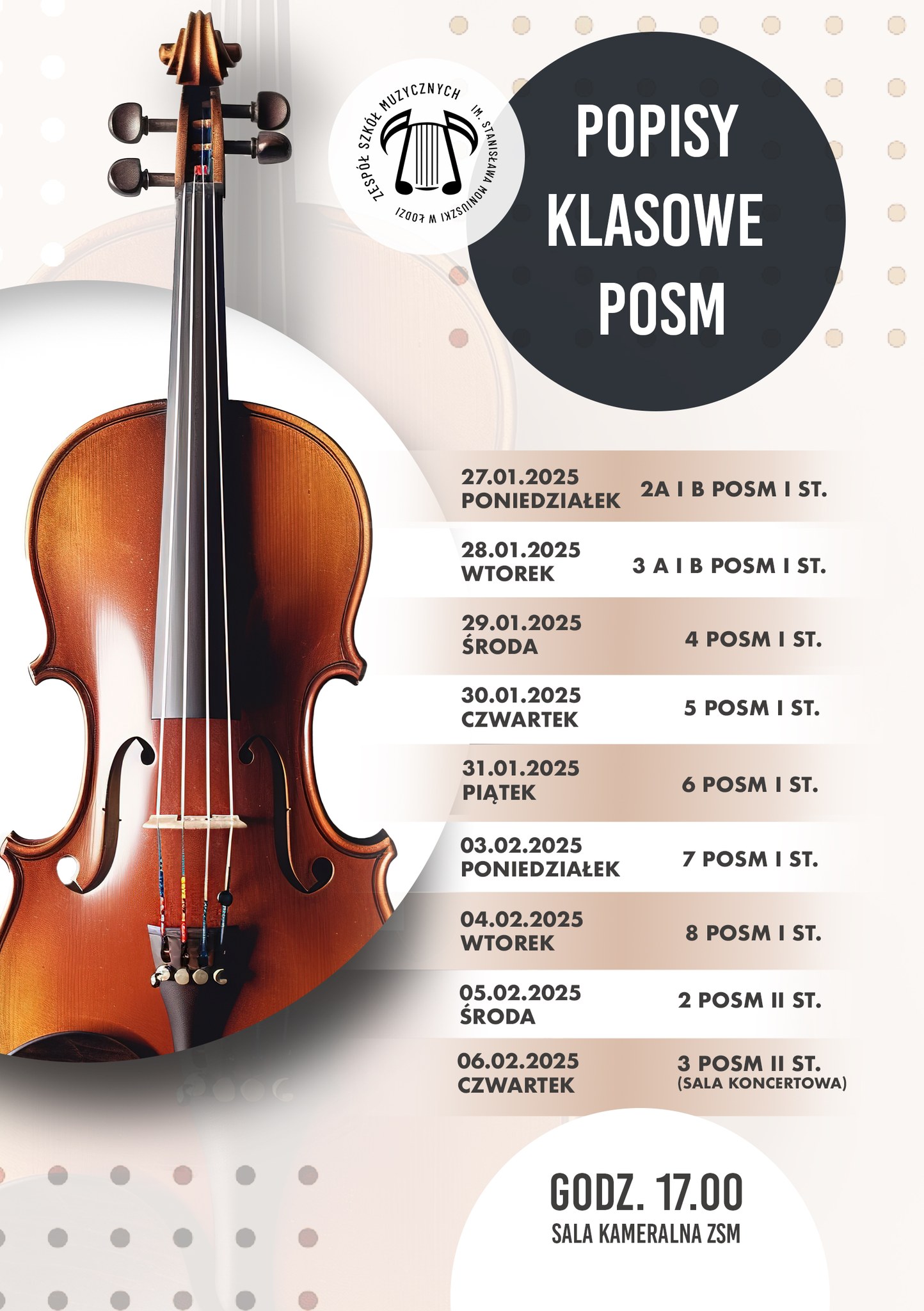 Od przyszłego poniedziałku zaczynamy muzyczny maraton popisów klasowych POSM. Wszystkie odbędą się o tej samej godzinie - 17.00, w sali kameralnej (z wyjątkiem najstarszych uczniów, którzy zaprezentują się na sali koncertowej).