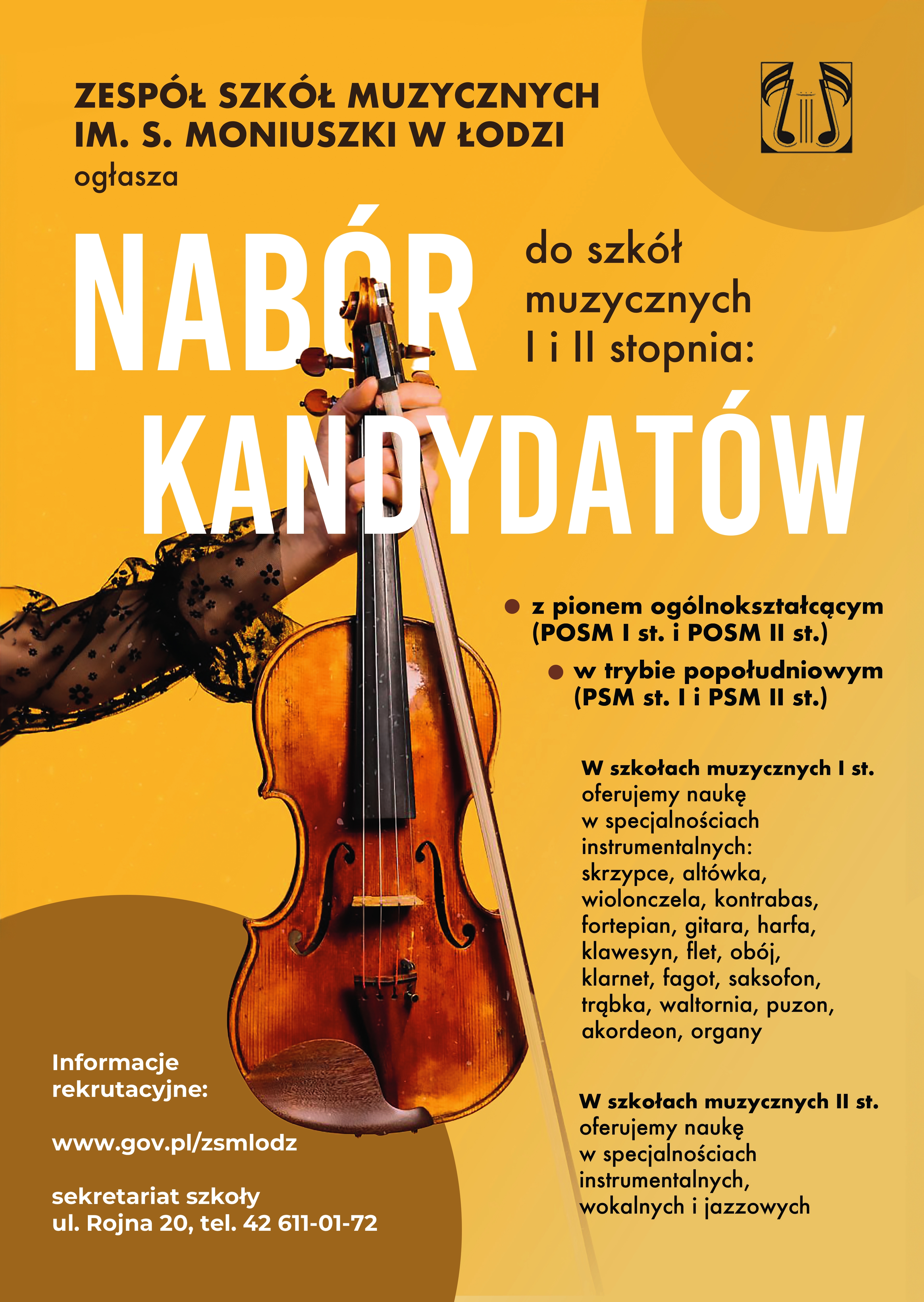 Dyrektor Zespołu Szkół Muzycznych im. Stanisława Moniuszki w Łodzi ogłasza rekrutację na rok szkolny 2024/2025.