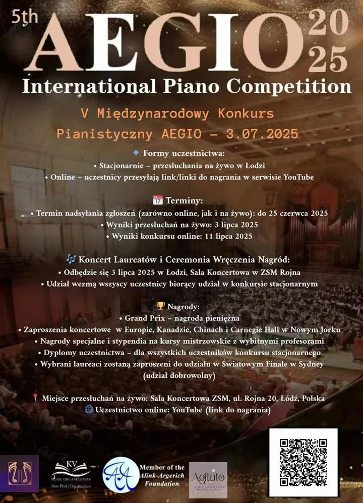Serdecznie zapraszamy do udziału w nadchodzącej edycji V Międzynarodowego Konkursu Pianistycznego AEGIO, który odbędzie się w Zespole Szkół Muzycznych im. Stanislawa Moniuszki w Łodzi – 3 lipca 2025 roku!