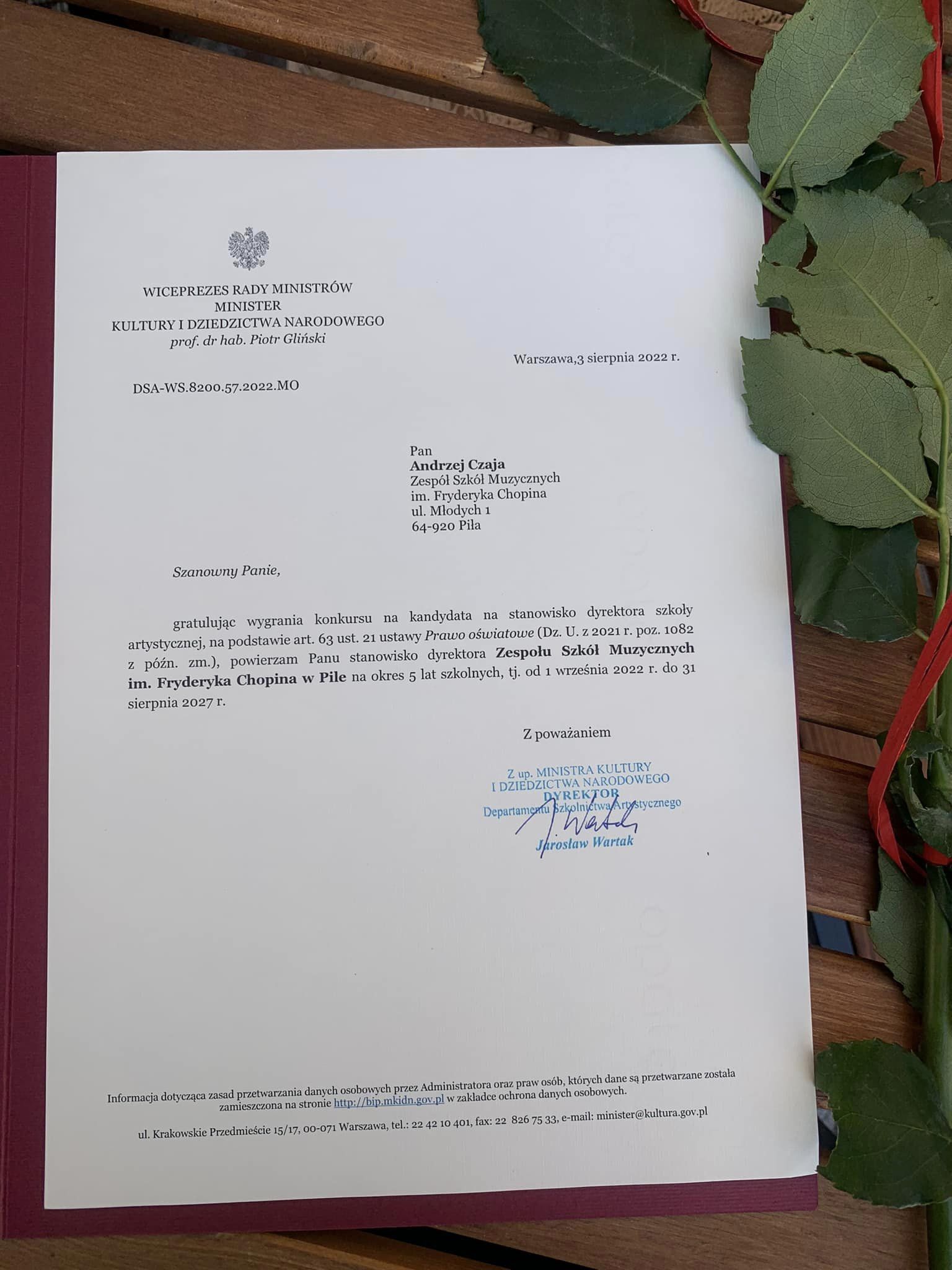 Andrzej Czaja - ceniony nauczyciel z wieloletnim doświadczeniem, animator i aktywny uczestnik życia kulturalnego po wygraniu konkursu na stanowisko dyrektora 3 sierpnia 2022 r. odebrał nominację z rąk Pana Jarosława Wartaka, Dyrektora Departamentu Szkolnictwa Artystycznego w Ministerstwie Kultury i Dziedzictwa Narodowego.