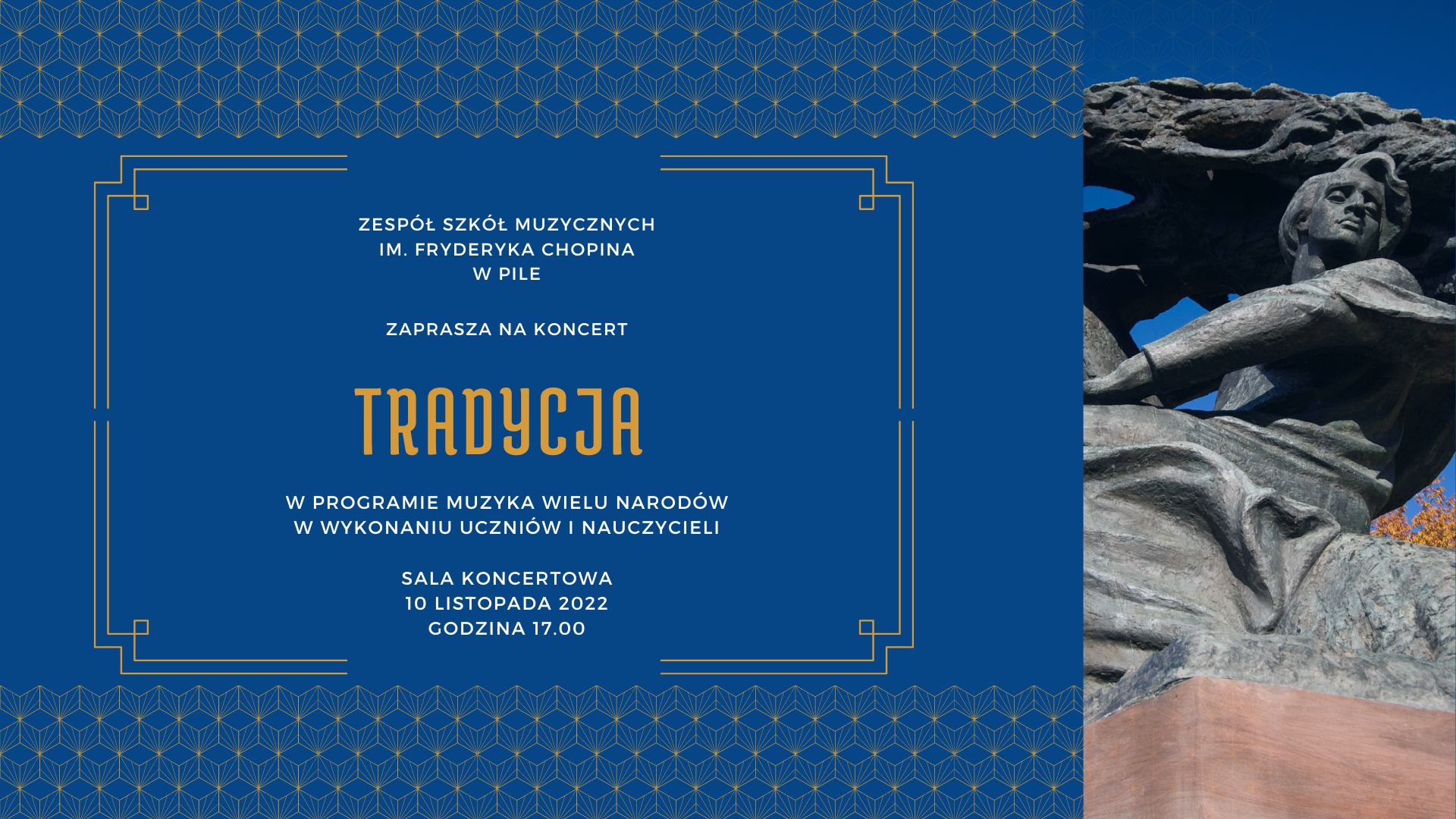 Zapraszamy na koncert "Tradycja". Wydarzenie odbędzie się w dniu 10 listopada 2022 r. o godzinie 17.00, w Sali Koncertowej Zespołu Szkół Muzycznych im. Fryderyka Chopina w Pile.