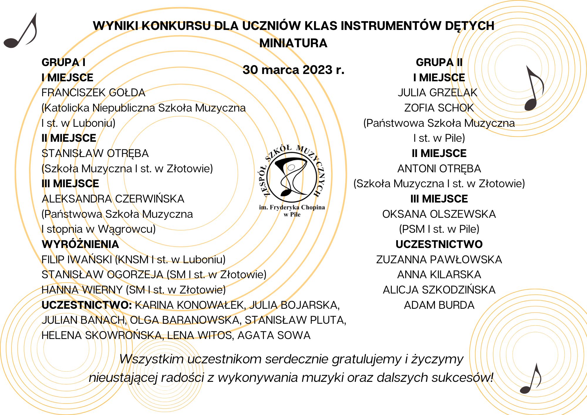 W konkursie wzięli udział, obok uczniów z naszej szkoły, także wykonawcy ze szkół muzycznych w Złotowie, Wągrowcu i Luboniu. Inicjatorką konkursu była Pani mgr Antonina Barbara Nowaczyk, kierowniczka Sekcji Instrumentów Dętych i Perkusji w Zespole Szkół Muzycznych im. Fryderyka Chopina w Pile. Wszystkim uczestnikom serdecznie gratulujemy i życzymy nieustającej radości z wykonywania muzyki oraz dalszych sukcesów! Z listą uczestników i laureatów zapoznać się można w galerii.