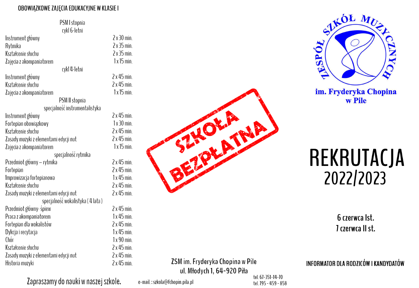 Państwowa Szkoła Muzyczna I stopnia im. Fryderyka Chopina w Pile prowadzi rekrutację na rok szkolny 2022/2023 w ramach wielu nauczanych specjalności. Zapraszamy do nauki dzieci i młodzież od 6 do 16 roku życia oraz rodziców do zapoznania się z naszą ofertą edukacyjną :