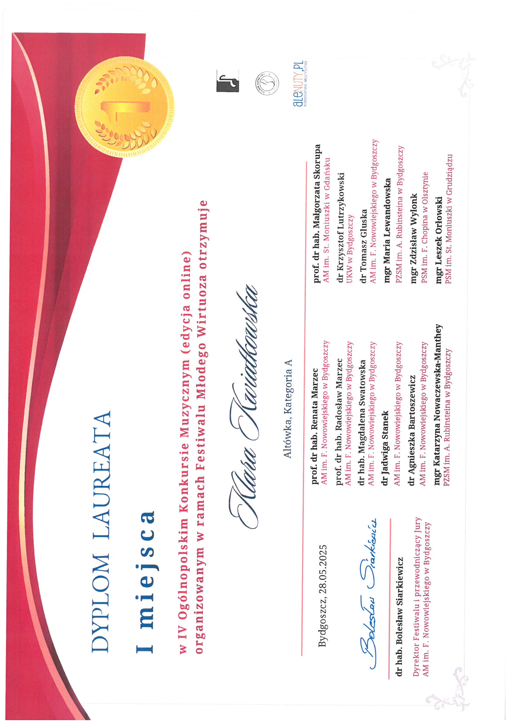 🥇 I miejsce w IV Ogólnopolskim Konkursie Muzycznym (edycja online), organizowanym w ramach Festiwalu Młodego Wirtuoza