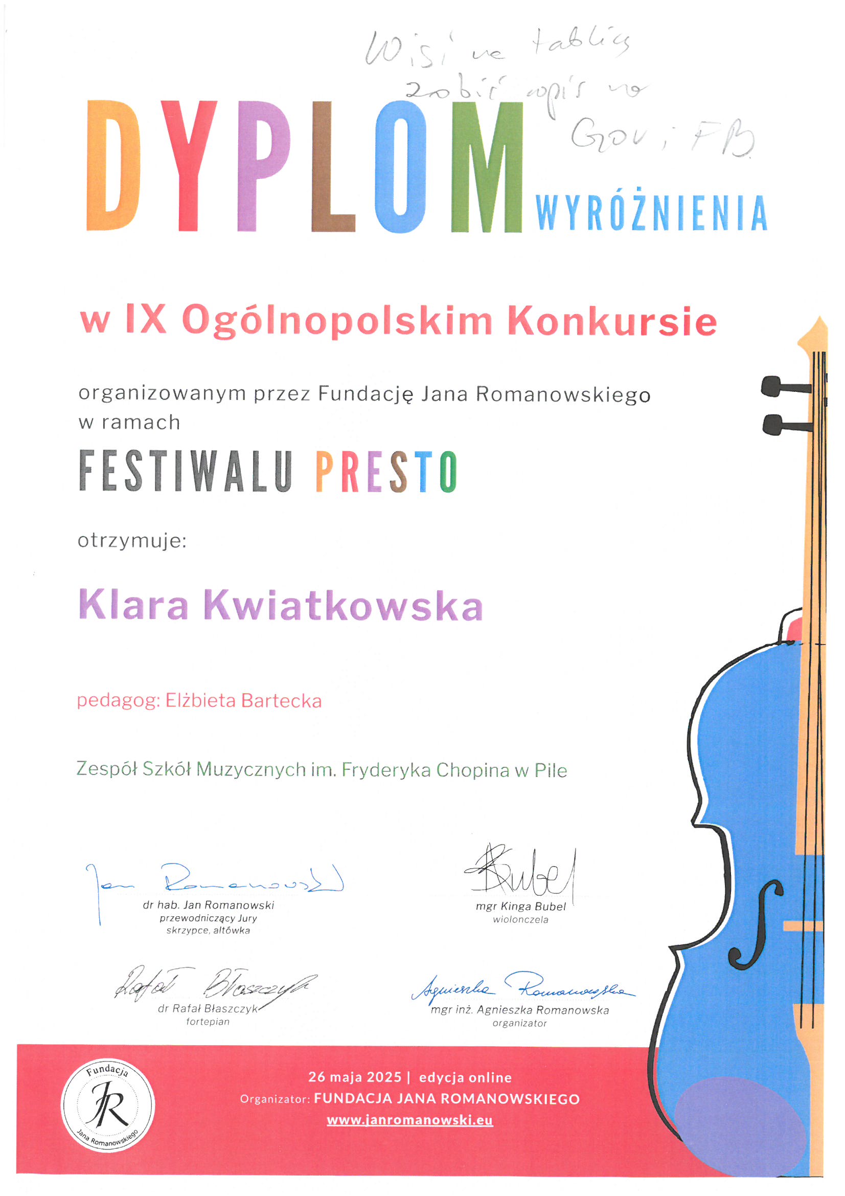 🏅 Wyróżnienie w IX Ogólnopolskim Konkursie organizowanym przez Fundację Jana Romanowskiego w ramach FESTIWALU PRESTO