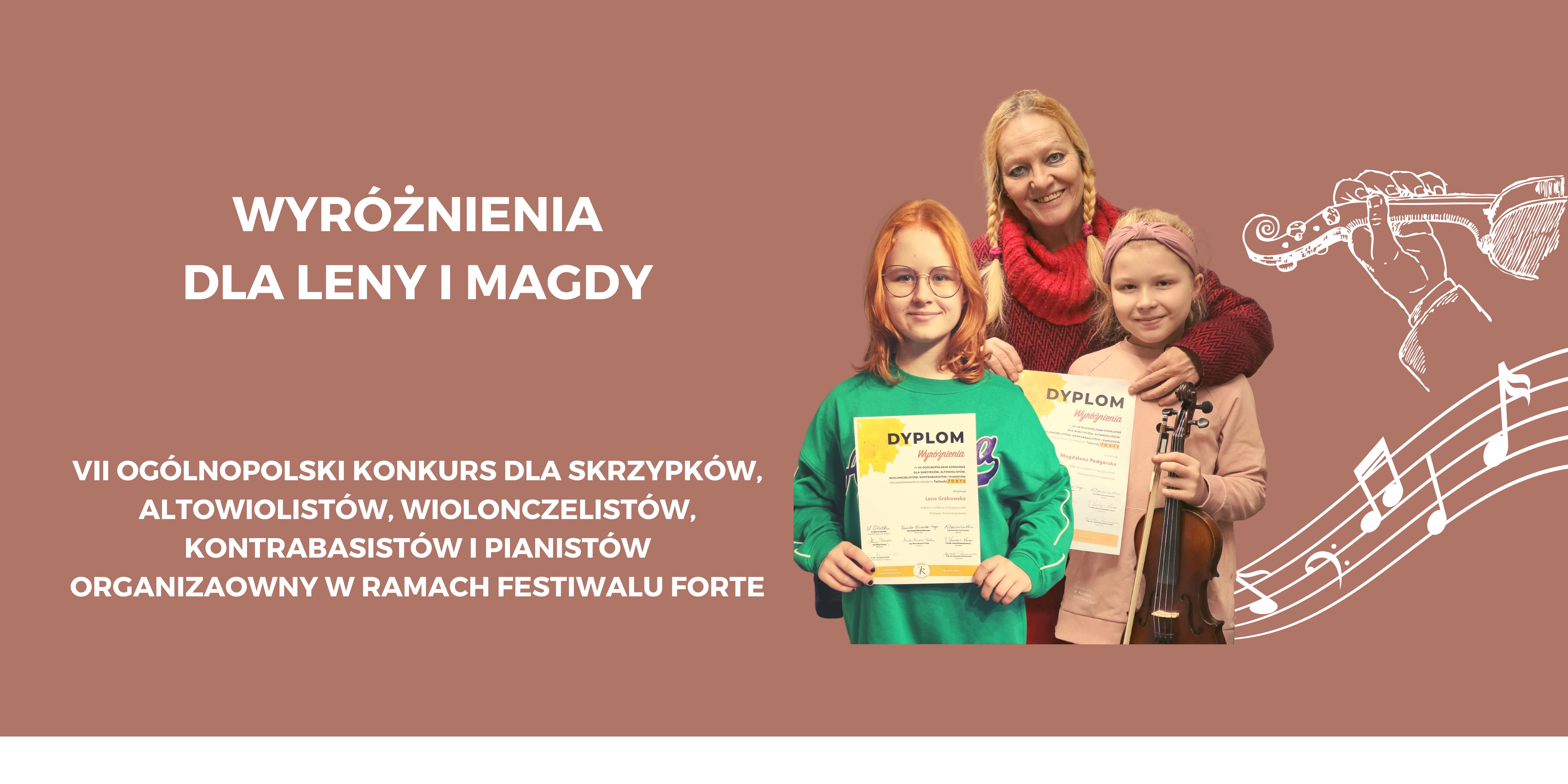 Magdalena Podgórska (kl. III, I st., c.6) i Lena Grabowska (kl. I, II stopnia) z klasy skrzypiec Pani Doroty Augustyniak zdobyły wyróżnienia na VII Ogólnopolskim Konkursie dla skrzypków, altowiolistów, wiolonczelistów, kontrabasistów i pianistów organizowanym w ramach Festiwalu Forte. Serdecznie gratulujemy i życzymy dalszych sukcesów!