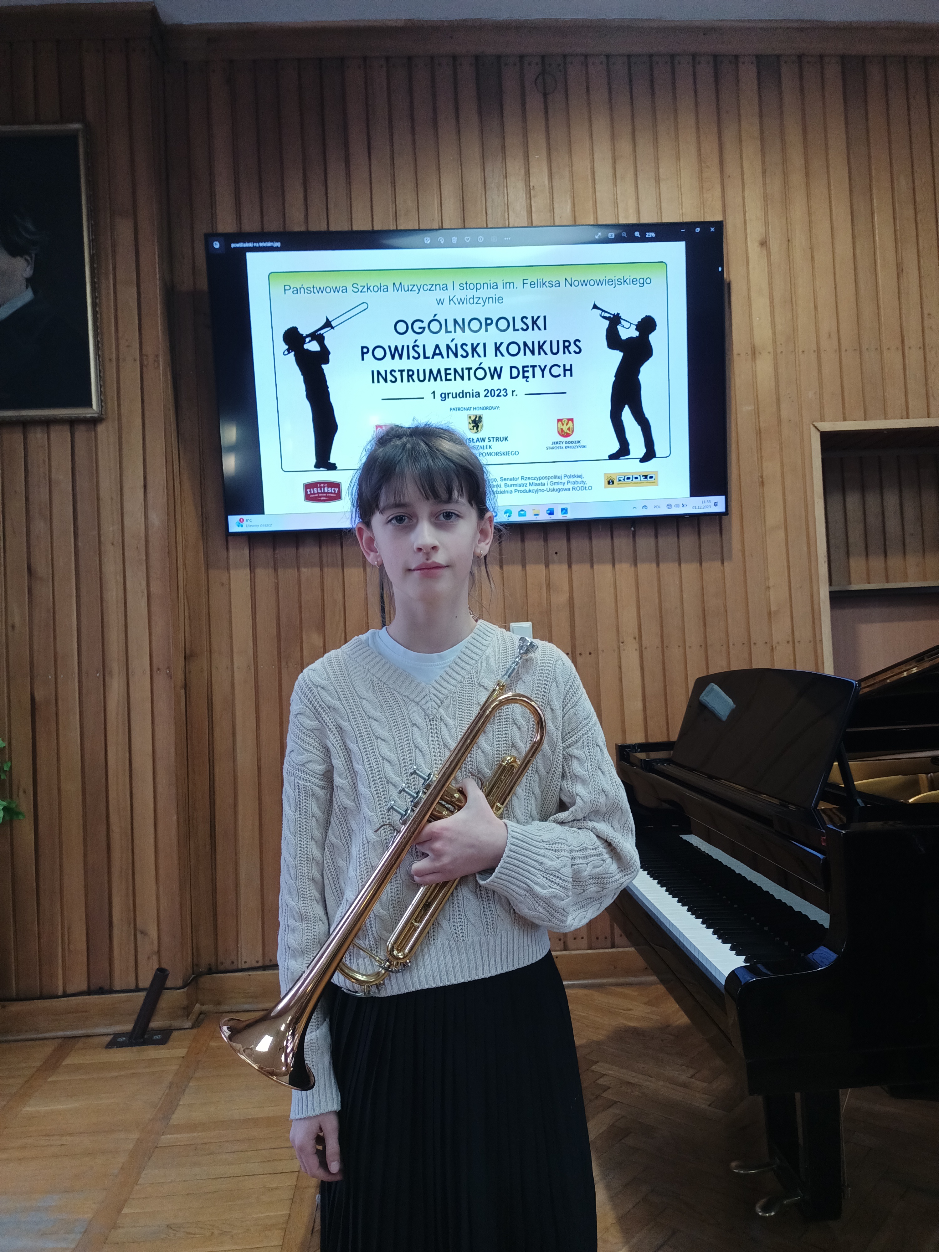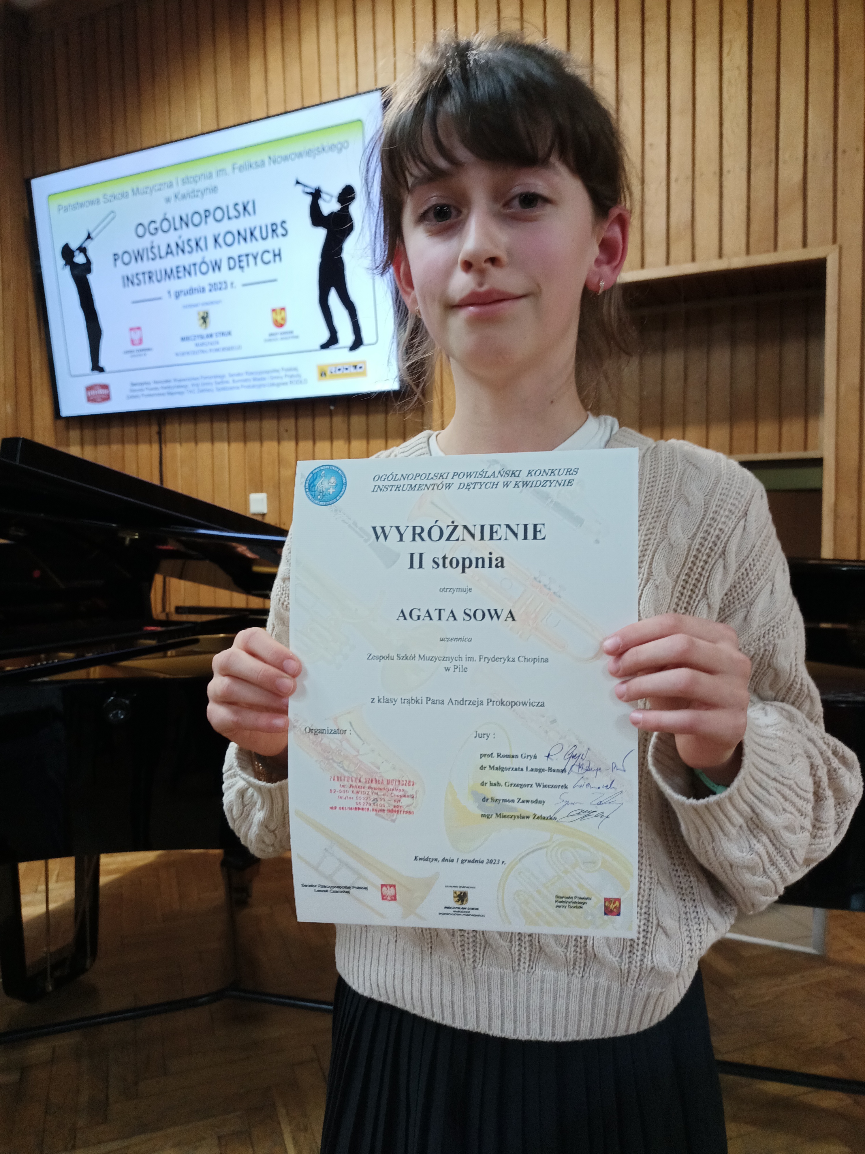 W dniu 1 grudnia 2023 r. odbył się Ogólnopolski Powiślański Konkurs Instrumentów Dętych w Kwidzynie, w którym udział wzięła nasza uczennica Agata Sowa, zdobywając zaszczytne wyróżnienie II stopnia. Agata uczy się w klasie Pana mgr. Andrzeja Prokopowicza. Składamy szczere gratulacje zarówno uczennicy, jak i nauczycielowi.