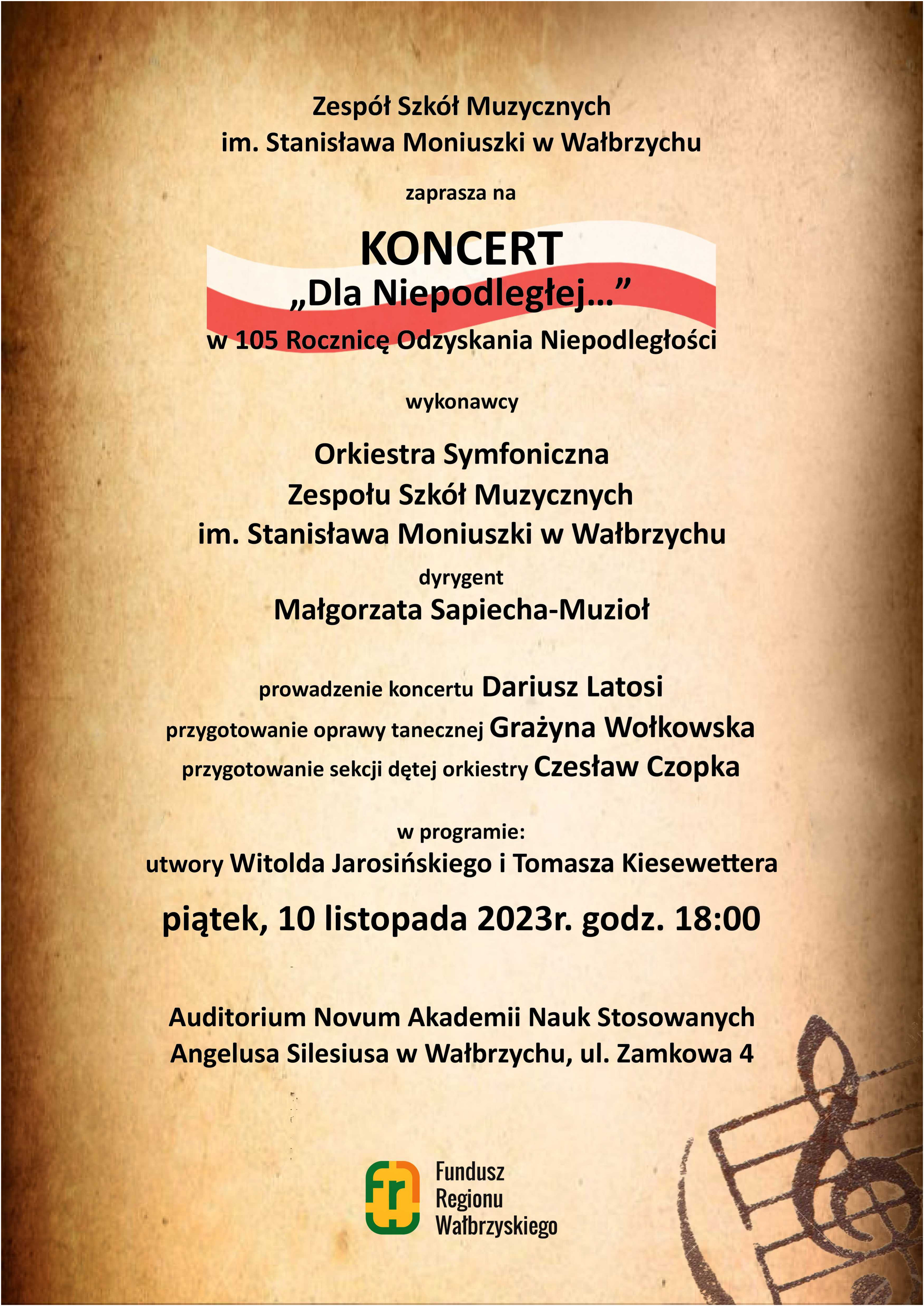 Zespół Szkół Muzycznych im. Stanisława Moniuszki w Wałbrzychu zaprasza na KONCERT Dla Niepodległej..." w 105 Rocznicę Odzyskania Niepodległości wykonawcy Orkiestra Symfoniczna Zespołu Szkół Muzycznych im. Stanisława Moniuszki w Wałbrzychu dyrygent Małgorzata Sapiecha-Muzioł prowadzenie koncertu Dariusz Latosi przygotowanie oprawy tanecznej Grażyna Wołkowska przygotowanie sekcji dętej orkiestry Czesław Czopka w programie: utwory Witolda Jarosińskiego i Tomasza Kiesewettera