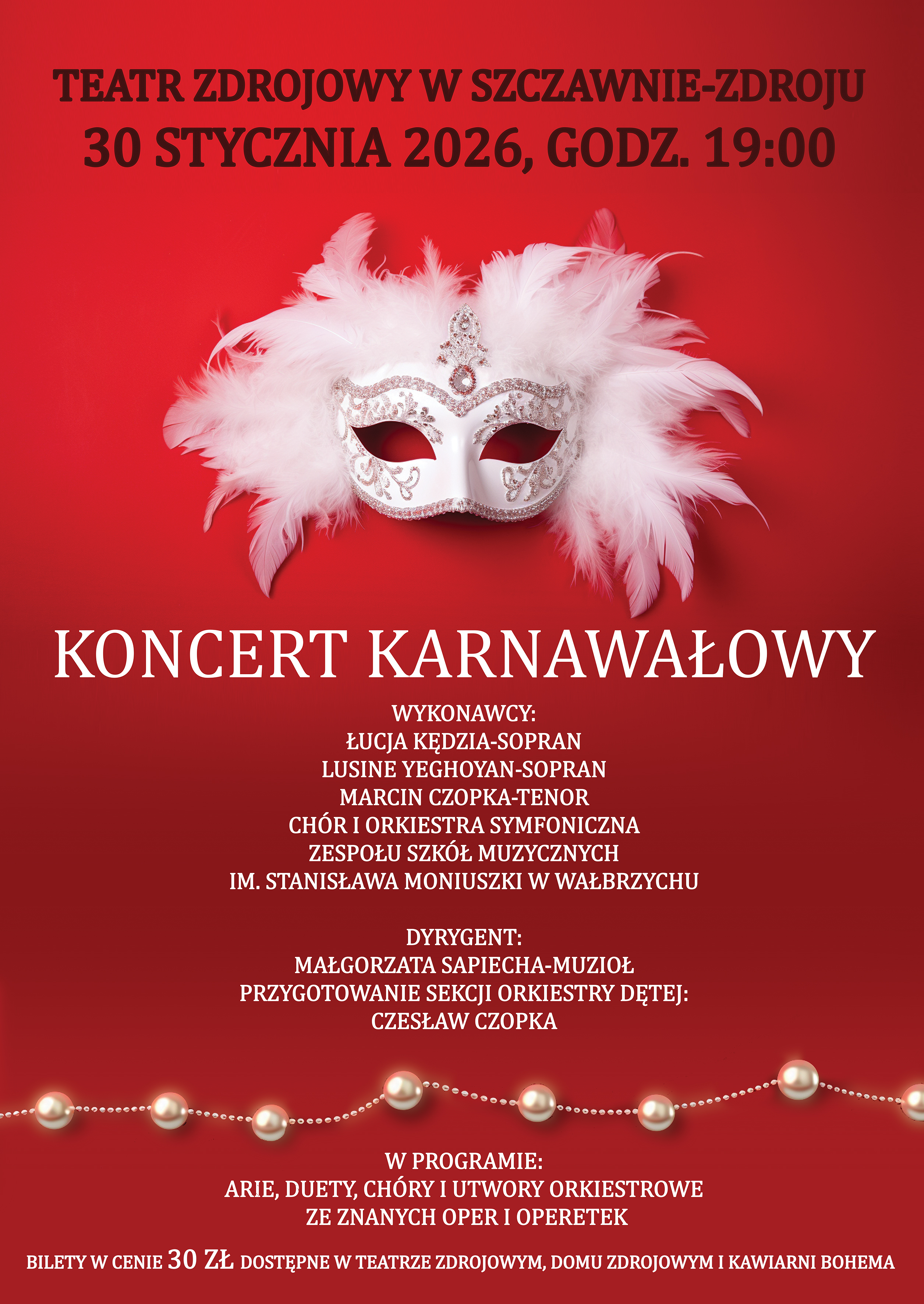 Koncert Karnawałowy, który odbył się 30 stycznia 2026r. w Teatrze Zdrojowym w Szczawnie-Zdroju, był wyjątkowym wydarzeniem artystycznym, które przyciągnęło liczną publiczność i wprowadziło słuchaczy w radosny nastrój. Zabytkowe wnętrza teatru, pełne elegancji i klasy, doskonale współgrały z charakterem wieczoru, tworząc niepowtarzalną atmosferę sprzyjającą muzycznym przeżyciom. Koncert z dużą swobodą i kulturą słowa prowadził Marcin Ciupidro, przybliżając publiczności program oraz wykonawców.