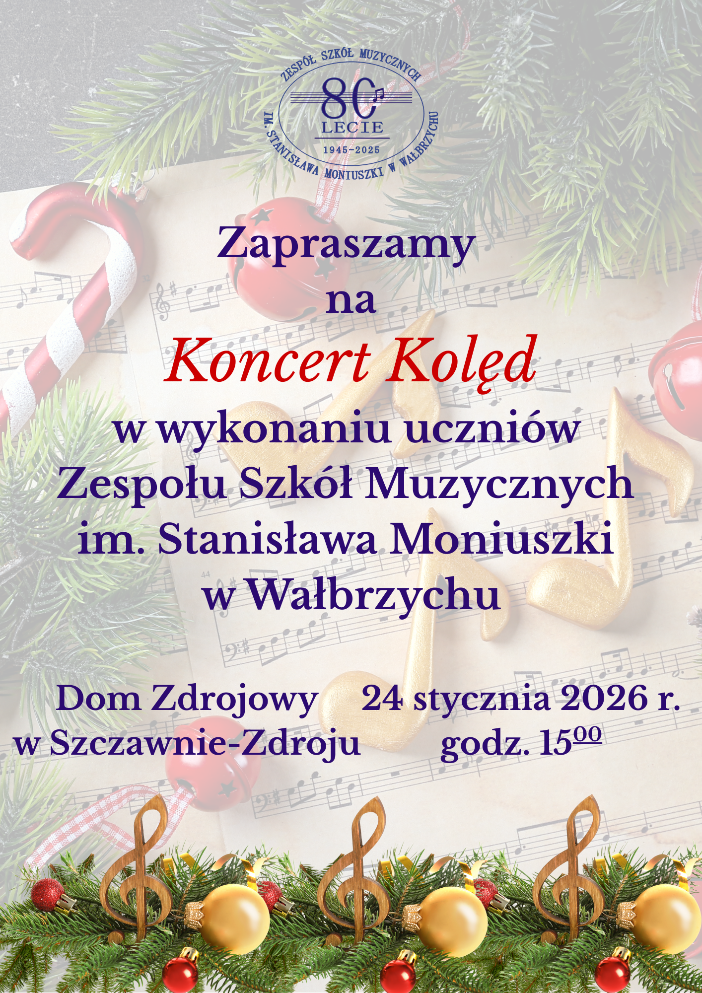 Zapraszamy na Koncert Kolęd w wykonaniu uczniów Zespołu Szkół Muzycznych im. Stanisława Moniuszki w Wałbrzychu.