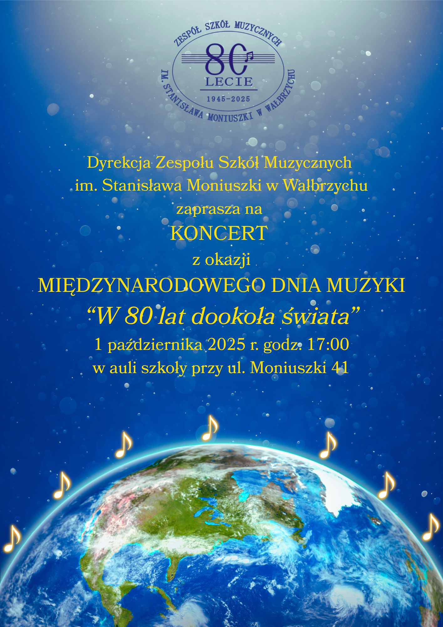 Dyrekcja Zespołu Szkół Muzycznych im. Stanisława Moniuszki w Wałbrzychu serdecznie zaprasza na wyjątkowy koncert z okazji Międzynarodowego Dnia Muzyki zatytułowany: