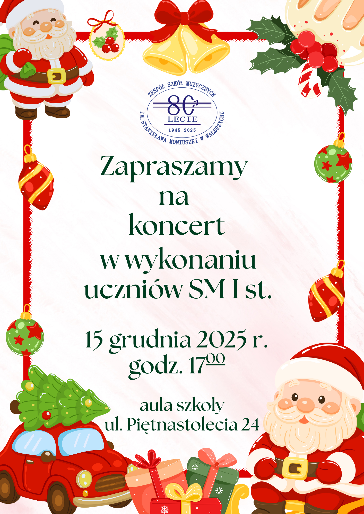 Dyrekcja Zespołu Szkół Muzycznych im. Stanisława Moniuszki w Wałbrzychu serdecznie zaprasza na koncert w wykonaniu uczniów Szkoły Muzycznej I stopnia, który odbędzie się 15 grudnia 2025 roku o godz. 17:00 w auli szkoły przy ul. Piętnastolecia 24.