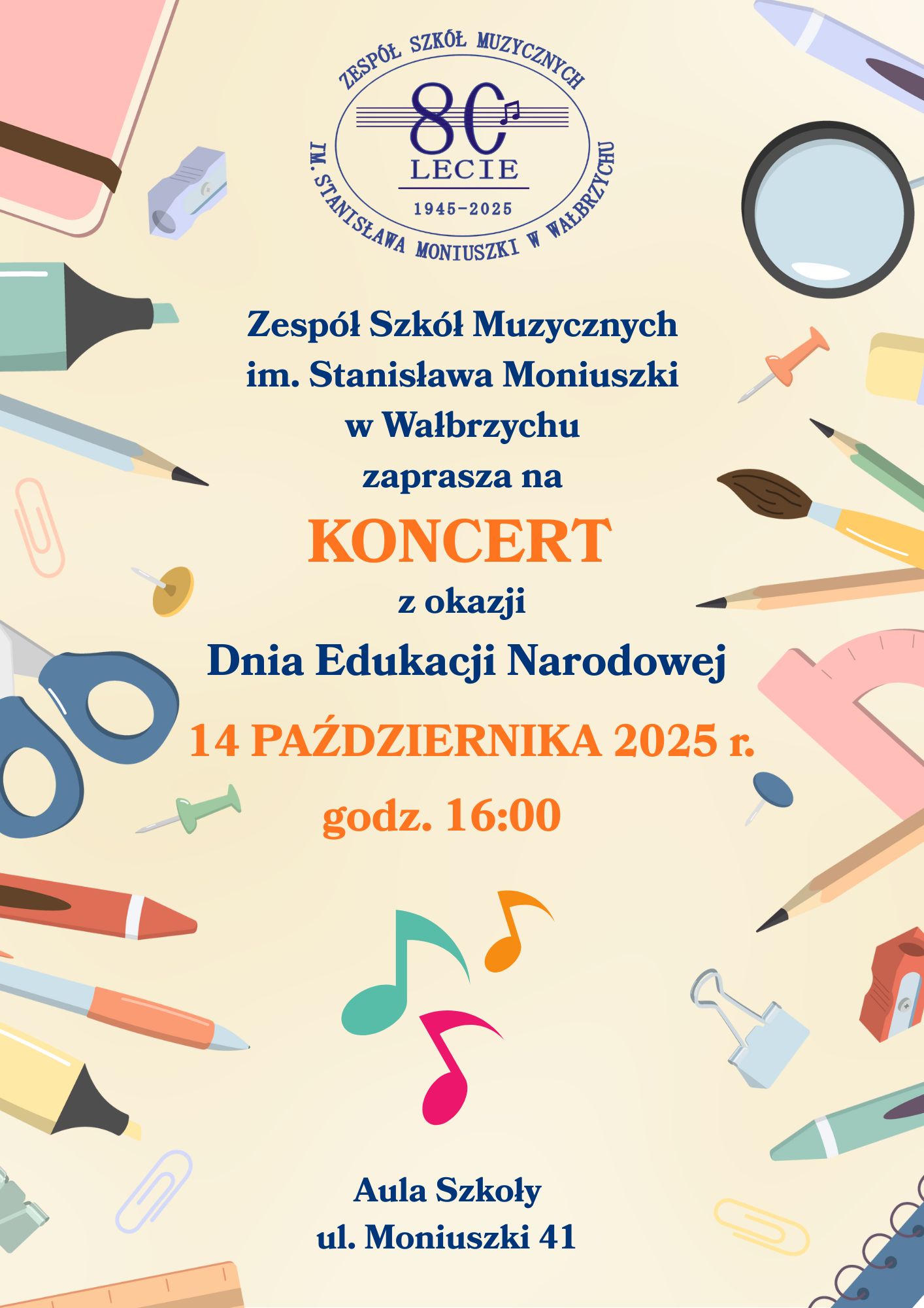 Zespół Szkół Muzycznych im. Stanisława Moniuszki w Wałbrzychu serdecznie zaprasza wszystkich miłośników muzyki na wyjątkowy koncert z okazji Dnia Edukacji Narodowej, który odbędzie się 14 października 2025 roku o godzinie 16:00 w auli szkoły przy ul. Moniuszki 41.