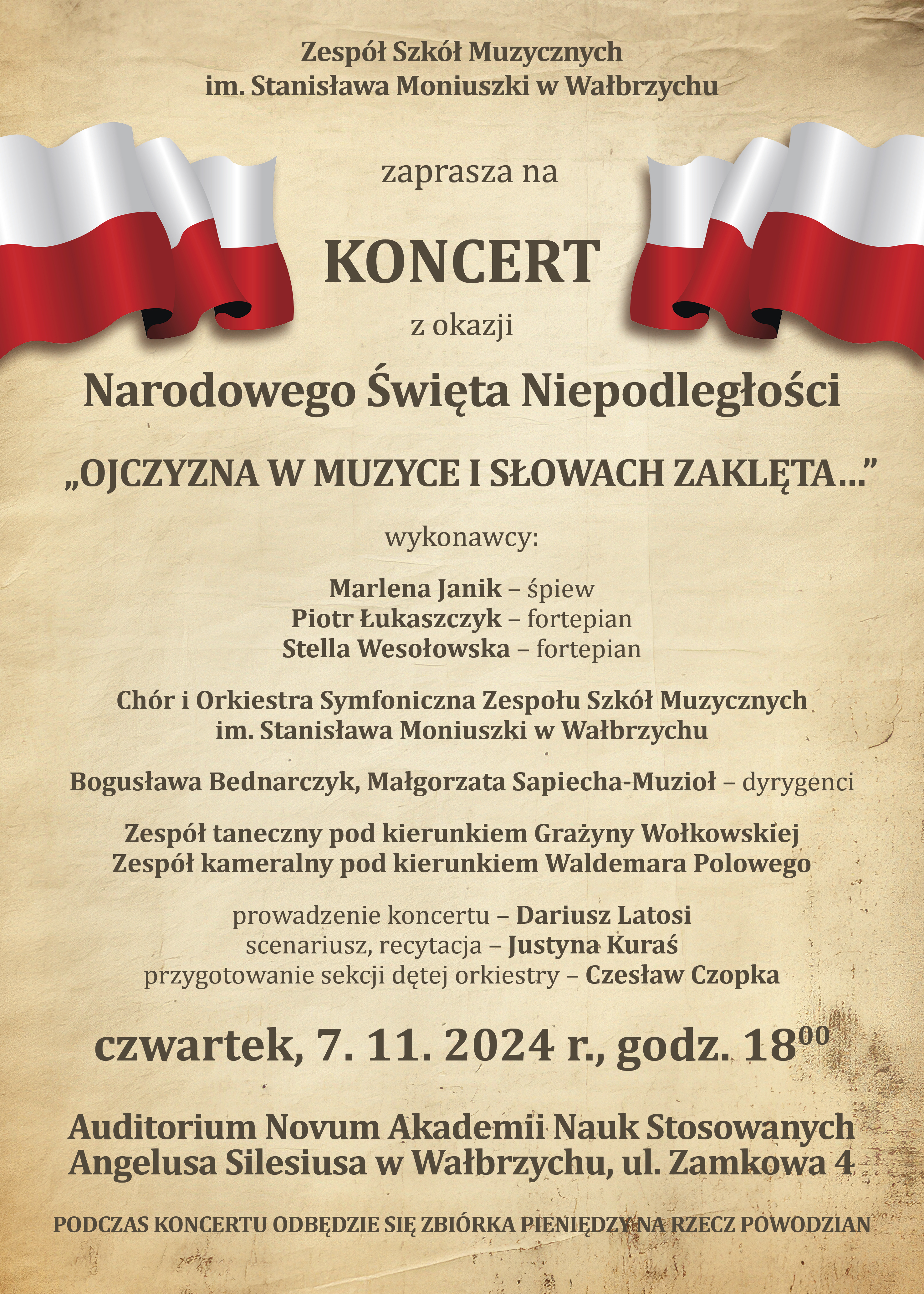 Dyrekcja Zespołu Szkół Muzycznych im. Stanisława Moniuszki w Wałbrzychu zaprasza na uroczysty koncert z okazji Narodowego Święta Niepodległości, który odbędzie się dnia 7 listopada 2024r., o godz. 18:00 w auli Auditorium Novum Akademii Nauk Stosowanych Angelusa Silesiusa przy ul. Zamkowej 4 w Wałbrzychu.