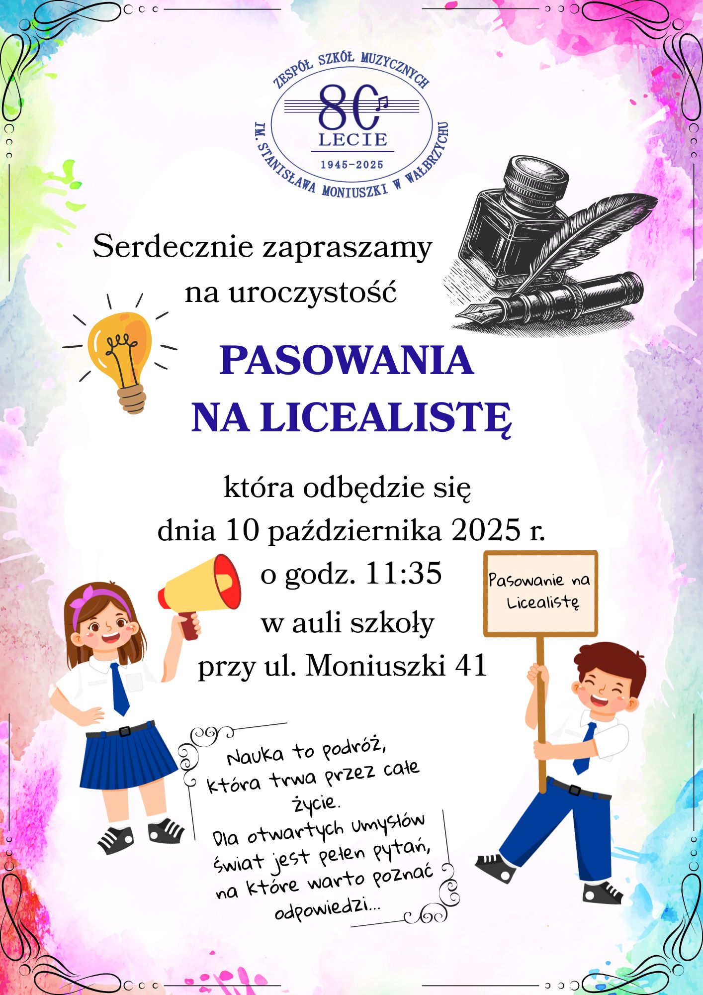 Zapraszamy na uroczystość pasowania na licealistę, która odbędzie się 10 października 2025 roku o godzinie 11:35 w auli Zespołu Szkół Muzycznych przy ulicy Moniuszki 41. To wyjątkowe wydarzenie w życiu szkoły, podczas którego nowi uczniowie oficjalnie zostaną przyjęci do społeczności liceum.