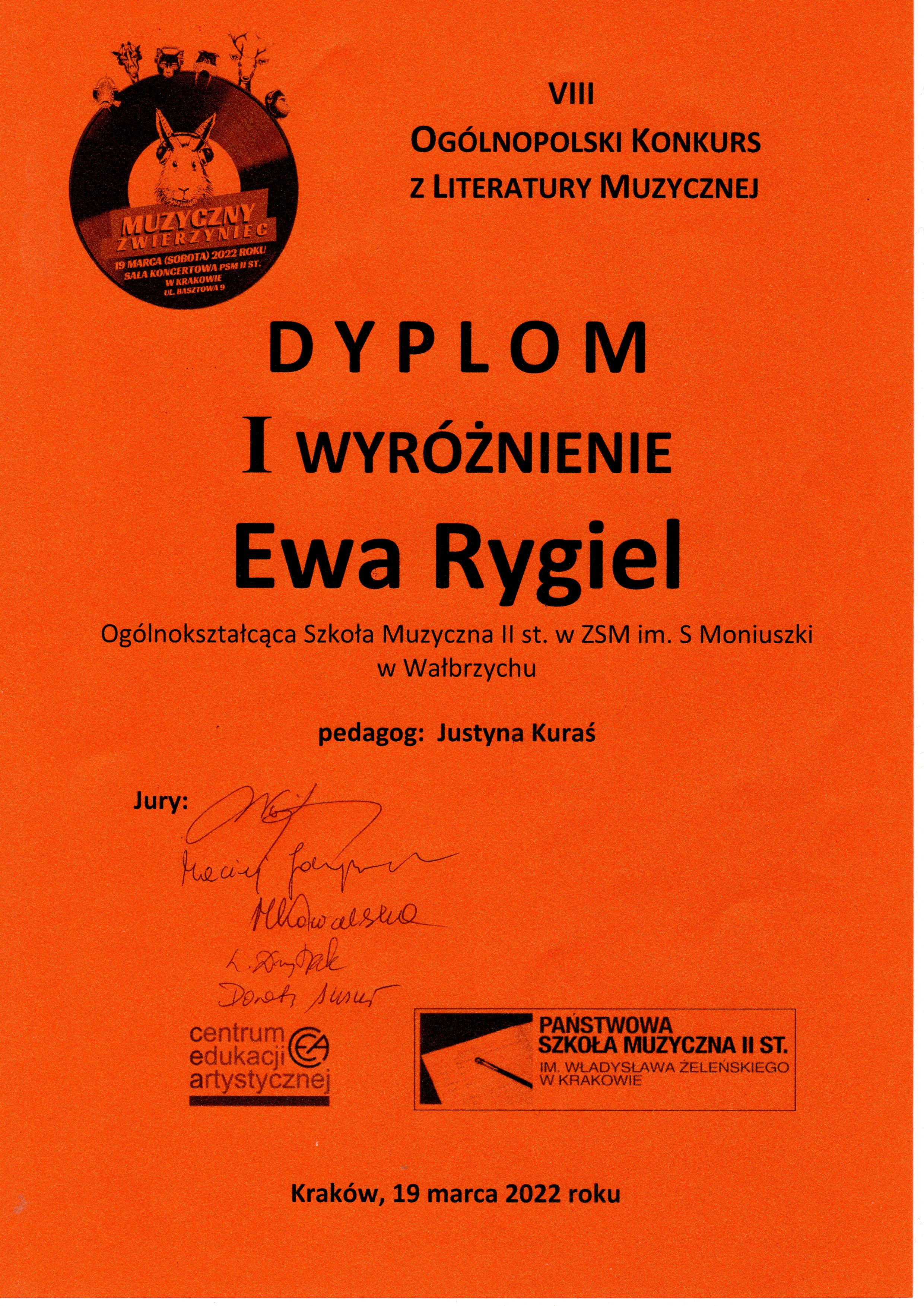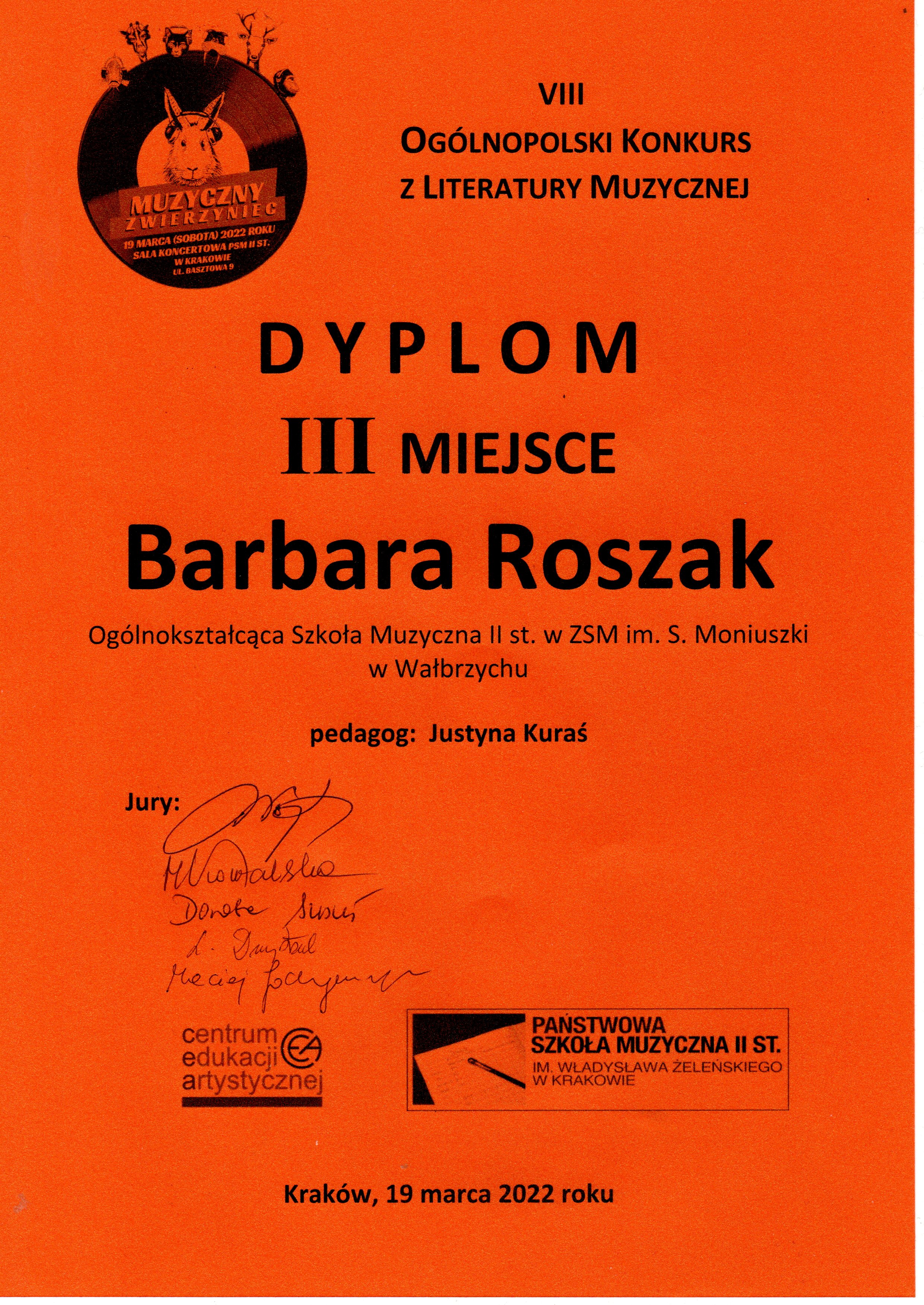W dniu 19 marca 2022r. w Państwowej Szkole Muzycznej im. Władysława Żeleńskiego w Krakowie odbył się VIII Ogólnopolski Konkurs z Literatury Muzycznej. W konkursie wzięły udział dwie nasze uczennice z kl. IV Ogólnokształcącej Szkoły Muzycznej II st. Barbara Roszak i Ewa Rygiel, które przygotowała Pani Justyna Kuras. BARBARA ROSZAK zajęła III miejsce, EWA RYGIEL otrzymała I wyróżnienie. Jest to kolejny sukces naszych uczniów i nauczyciela p. Justyny Kuraś w tym prestiżowym Ogólnopolskim Konkursie z Literatury Muzycznej.