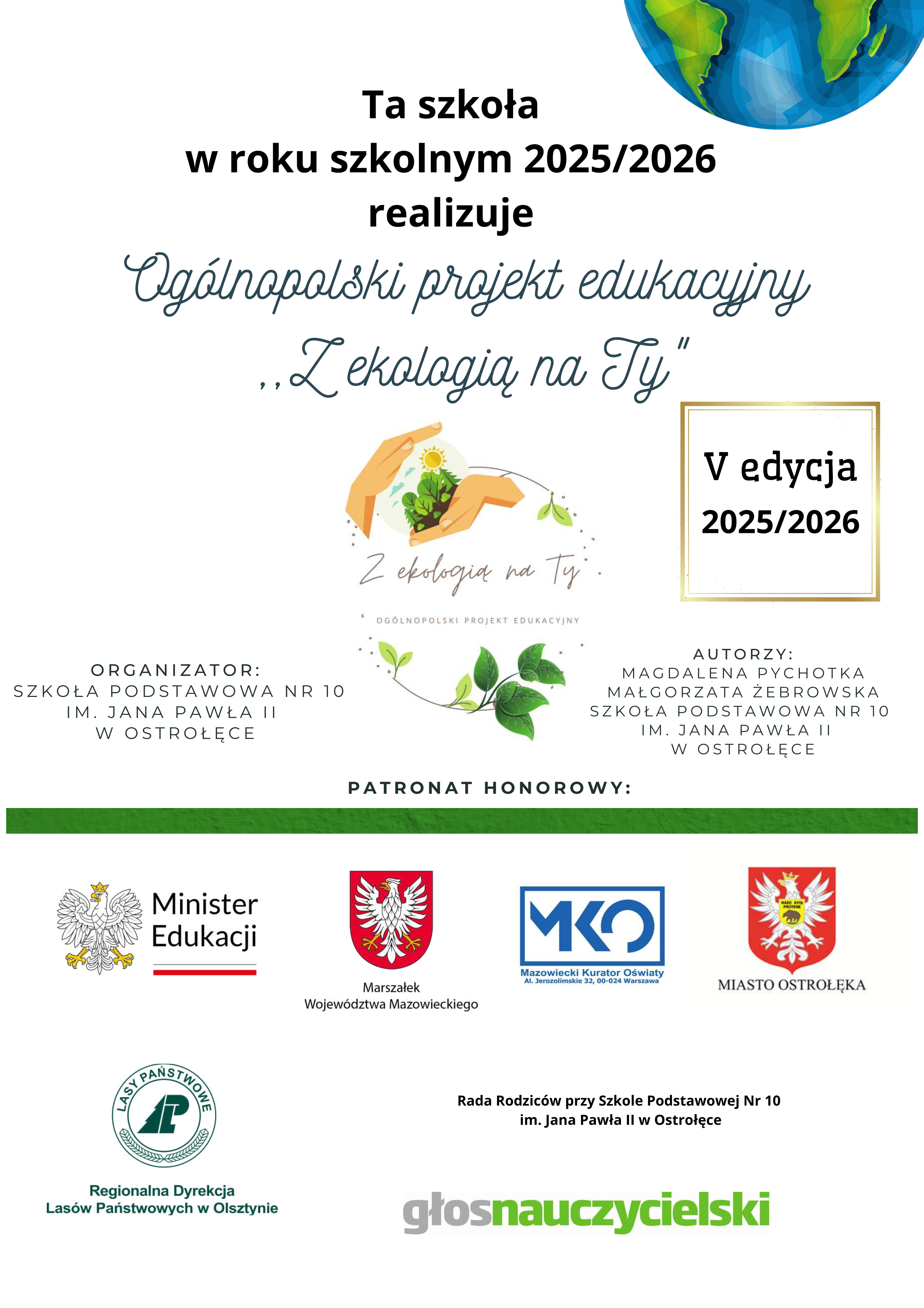 W roku szkolnym 2025/2026 nasza szkoła realizuje V edycję ogólnopolskiego projektu edukacyjnego „Z ekologią na Ty”. Celem projektu jest kształtowanie postaw proekologicznych, poszerzanie wiedzy na temat ochrony środowiska oraz wdrażanie działań na rzecz zrównoważonego rozwoju. Organizatorem projektu jest Szkoła Podstawowa nr 10 im. Jana Pawła II w Ostrołęce, a autorkami są Magdalena Pychotka i Małgorzata Żebrowska.