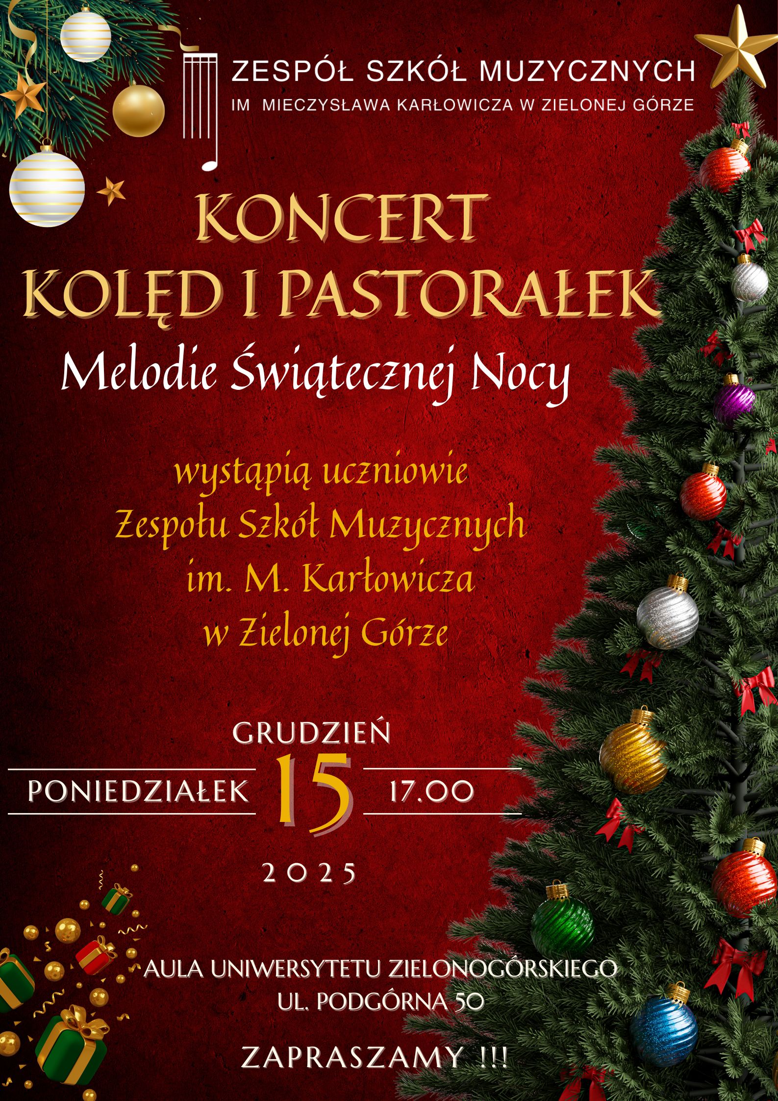 Zapraszamy na Koncert Kolęd i Pastorałek "Melodie Świątecznej Nocy" w którym wystąpią uczniowie Zespołu Szkół Muzycznych im. M. Karłowicza w Zielonej Górze. Koncert odbędzie się 15 grudnia 2025 r. o godz. 17.00 w Auli Uniwersytetu Zielonogórskiego ul. Podgórna 50.