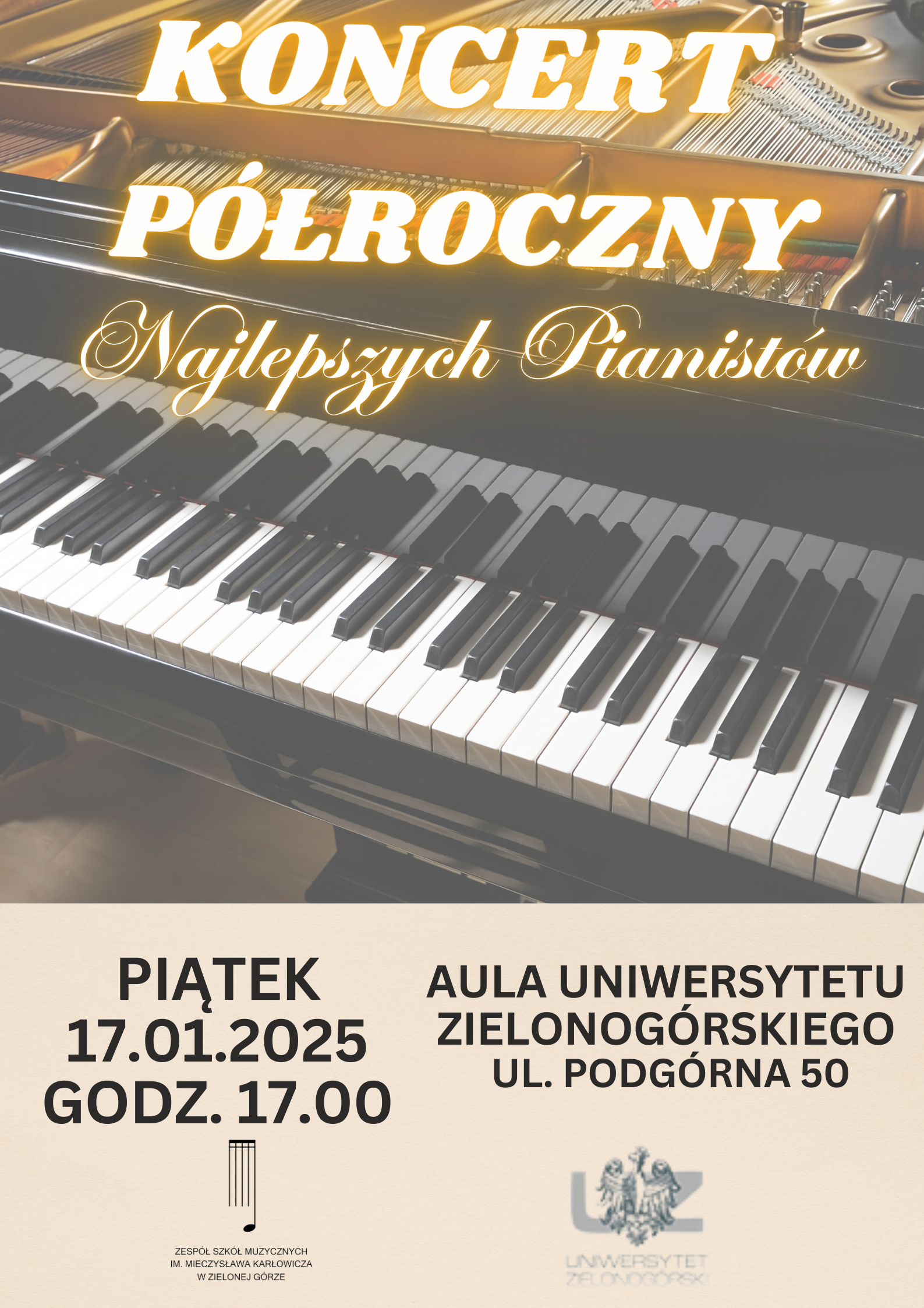 Serdecznie zapraszamy Państwa na Koncert Półroczny Najlepszych Pianistów, który odbędzie się w piątek, 17.01.2025 r., o godz. 17.00 w Auli Uniwersytetu Zielonogórskiego, ul. Podgórna 50.
