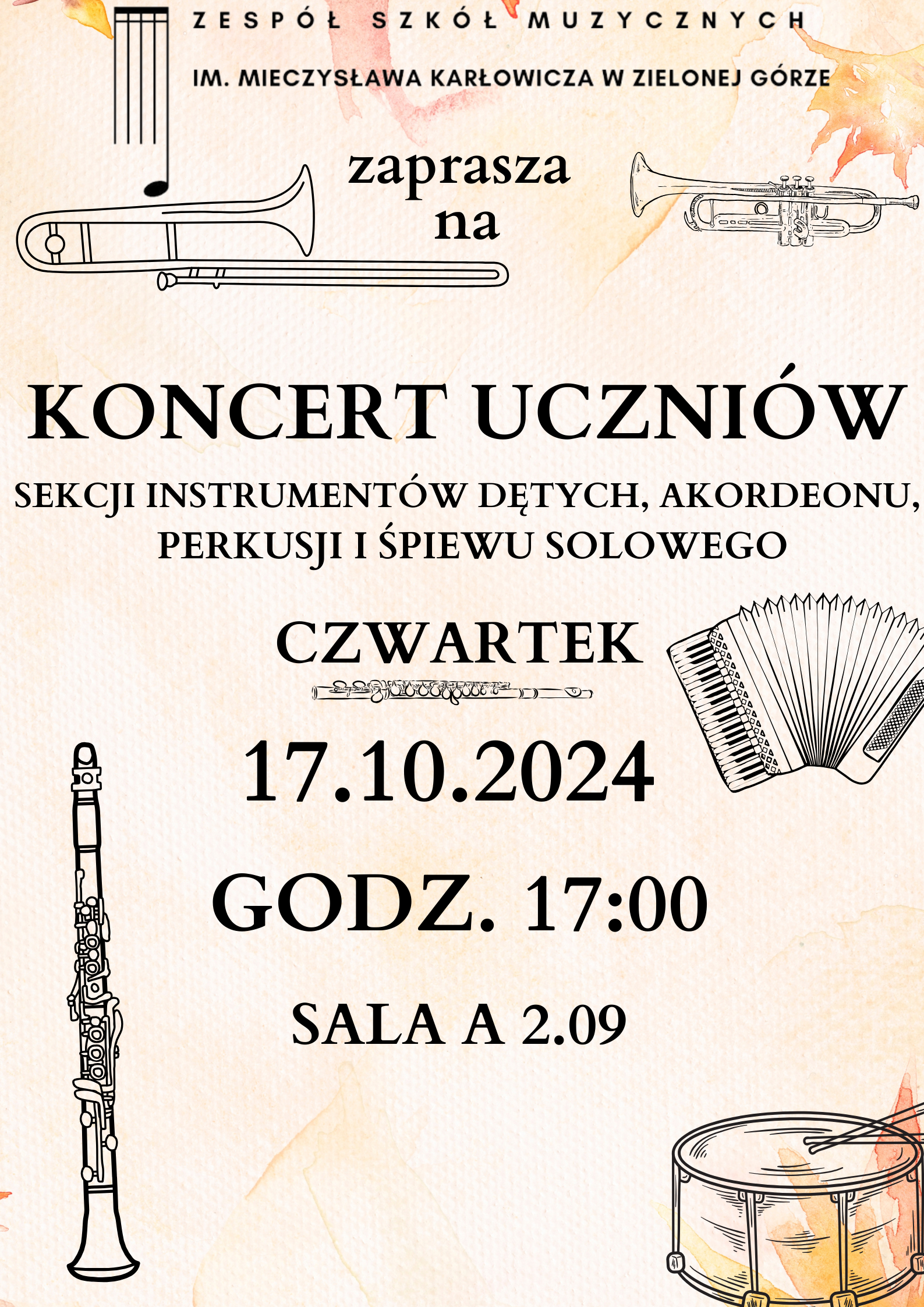 Serdecznie zapraszamy na koncert uczniów Sekcji Instrumentów Dętych, Akordeonu, Perkusji i Śpiewu Solowego, który odbędzie się w czwartek, 17 października 2024 r. o godzinie 17:00 w Sali A 2.09. Wstęp wolny!