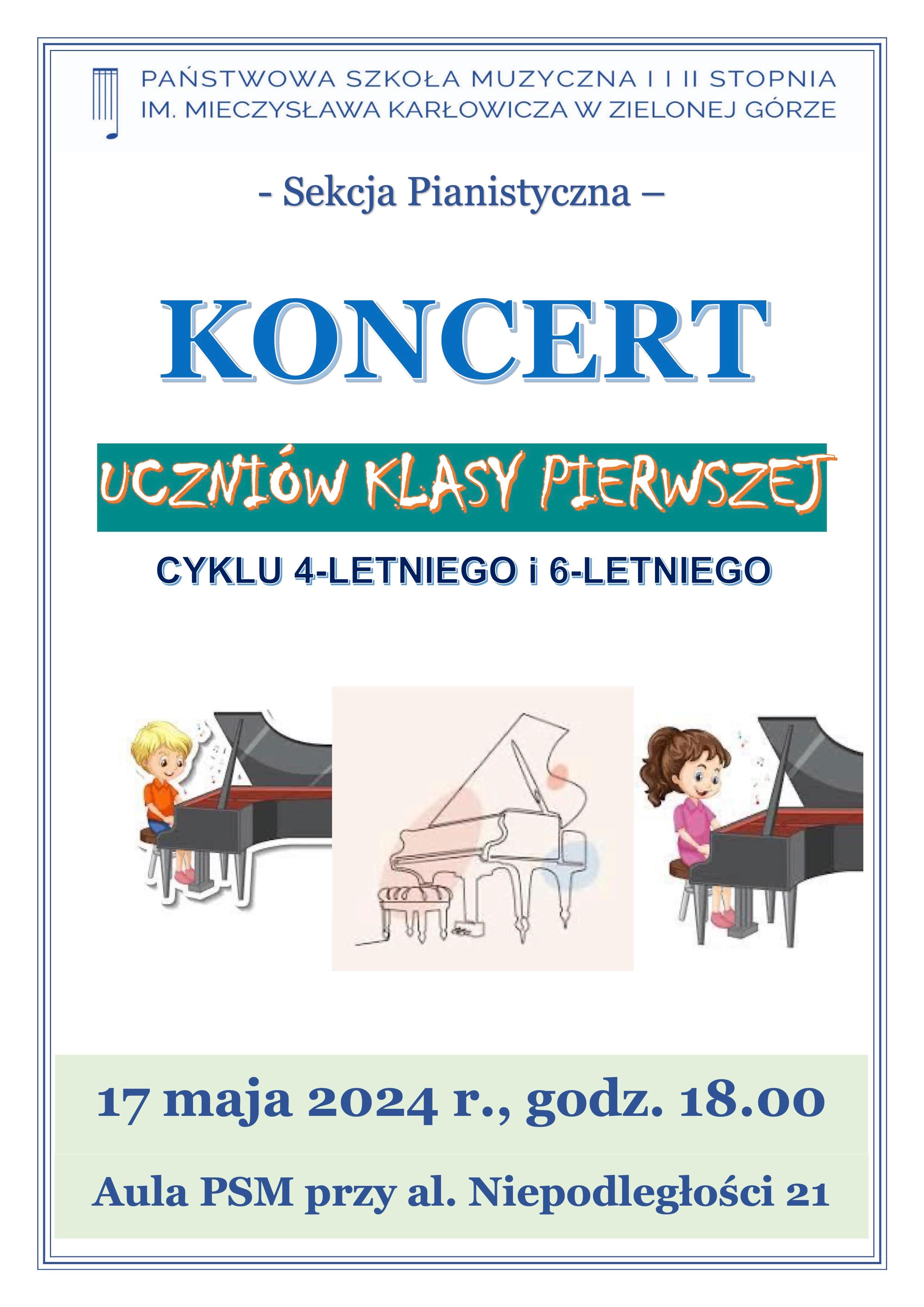 Zapraszamy na koncerty uczniów klasy I - Sekcja Pianistyczna w dniu 17 maja o 18.00