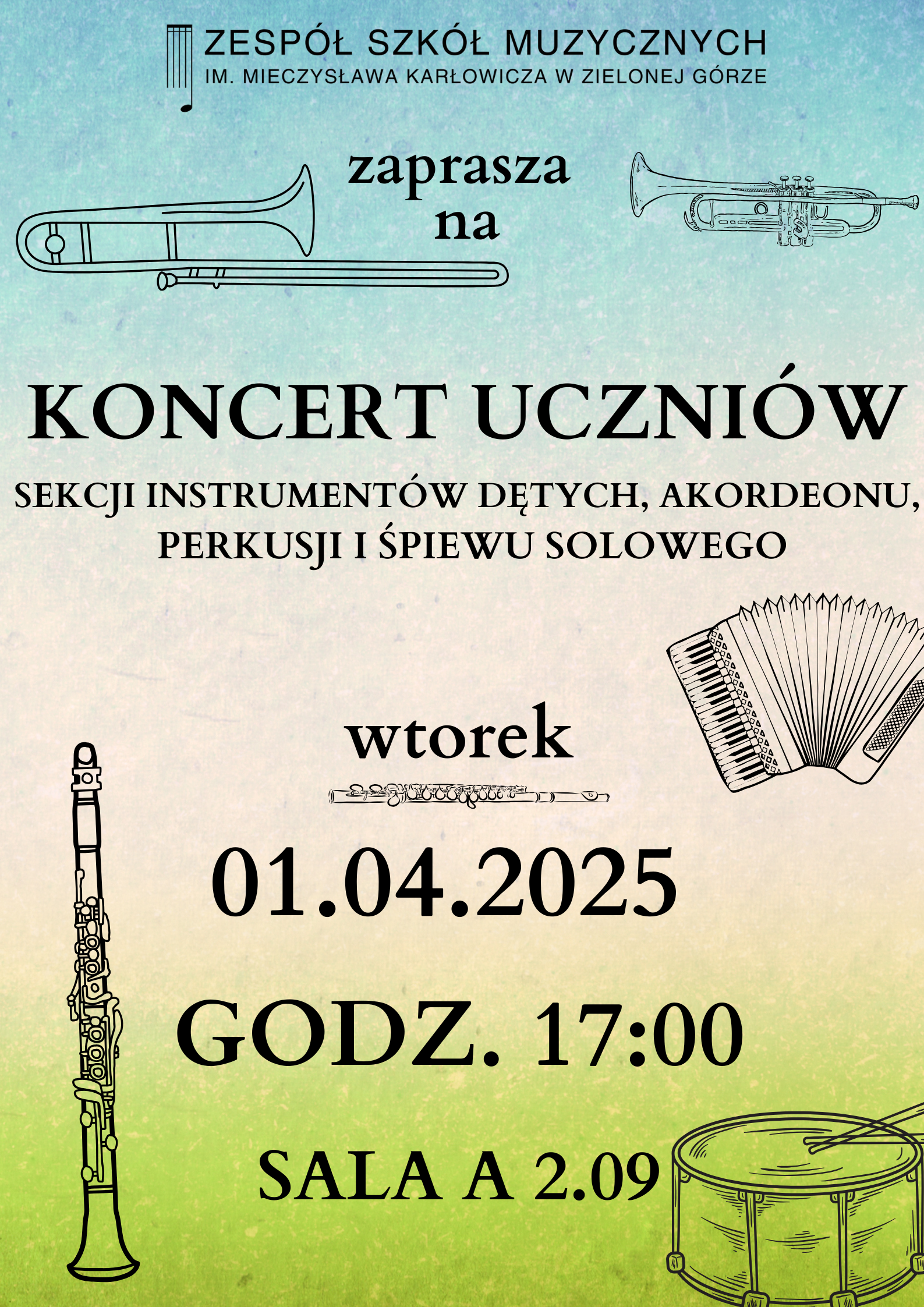 Koncert uczniów Sekcji Instrumentów Dętych, Akordeonu, Perkusji i Śpiewu Solowego - 1.04.2025 r.