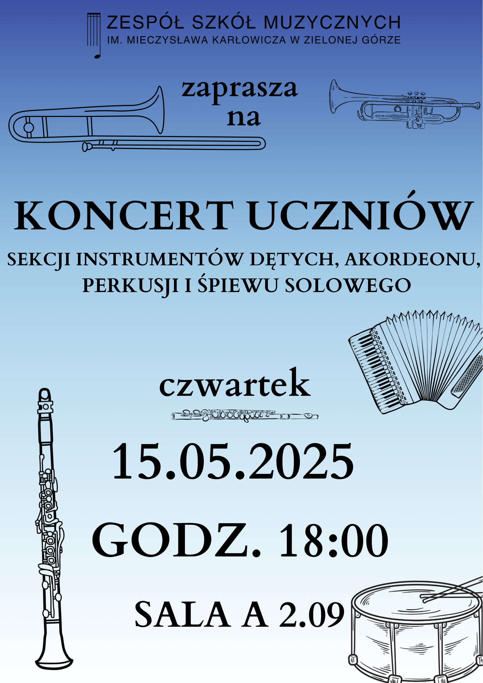 Serdecznie zapraszamy na koncert uczniów Sekcji Instrumentów Dętych, Akordeonu, Perkusji i Śpiewu Solowego, który odbędzie się w czwartek, 15 maja 2025 r. o godzinie 18.00 w Sali A 2.09. Wstęp wolny!