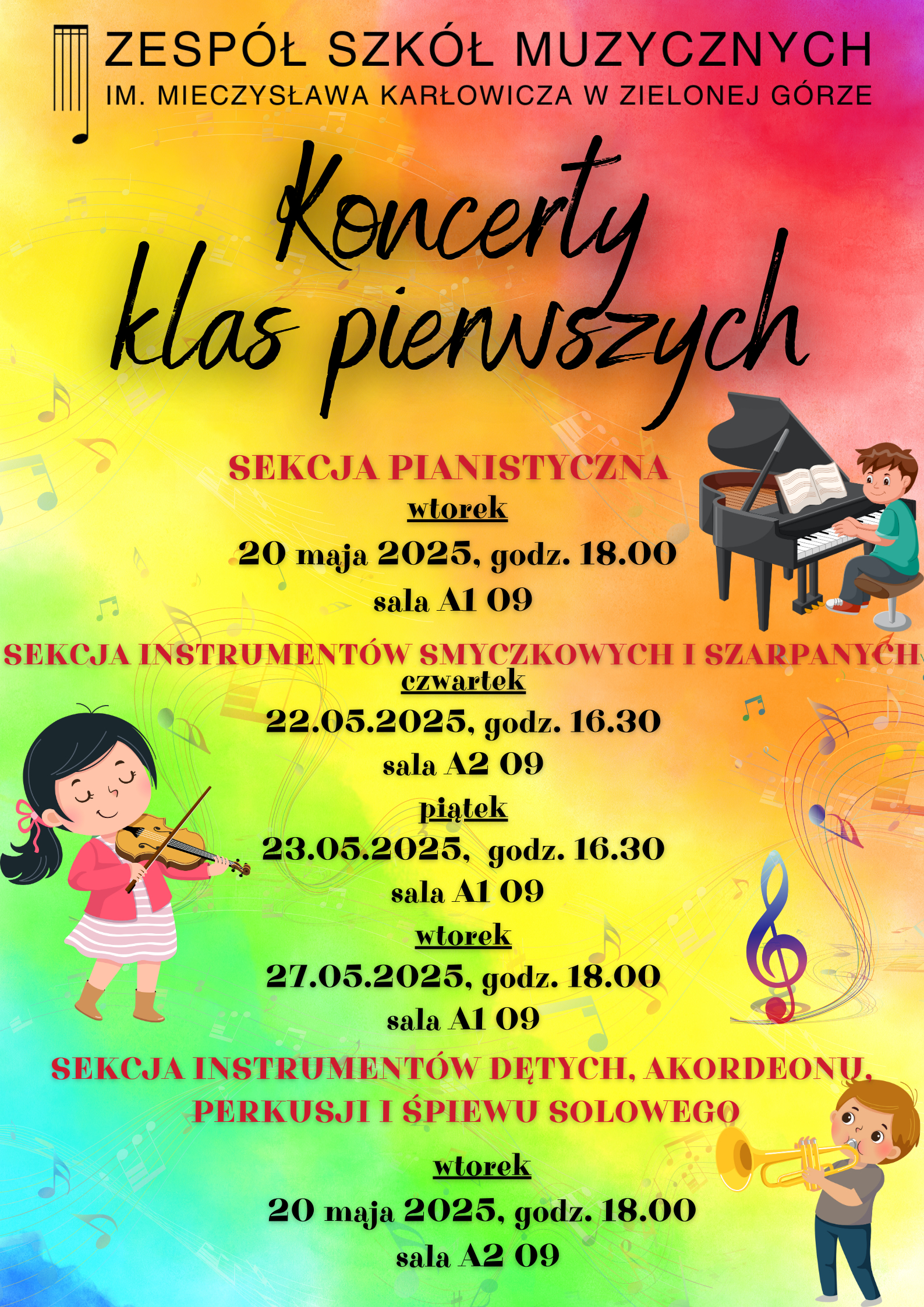Na banerze, na tęczowym tle znajdują się trzy rysunki dzieci grających na fortepianie, skrzypcach i trąbce, kolorowe pięciolinie i klucze wiolinowe oraz nuty. Plakat zapowiada koncerty klas pierwszych. Całość opatrzona logo zespołu szkół muzycznych.