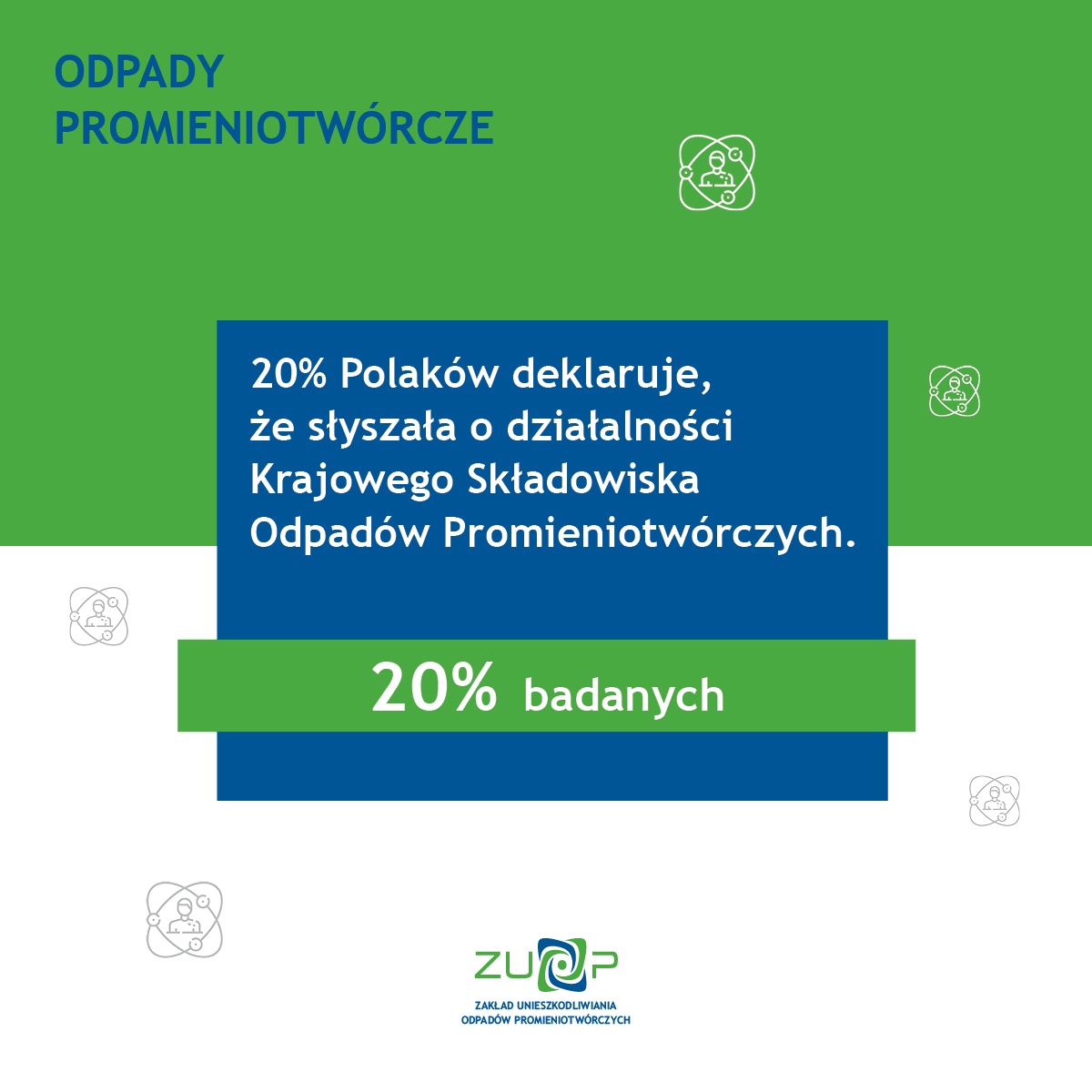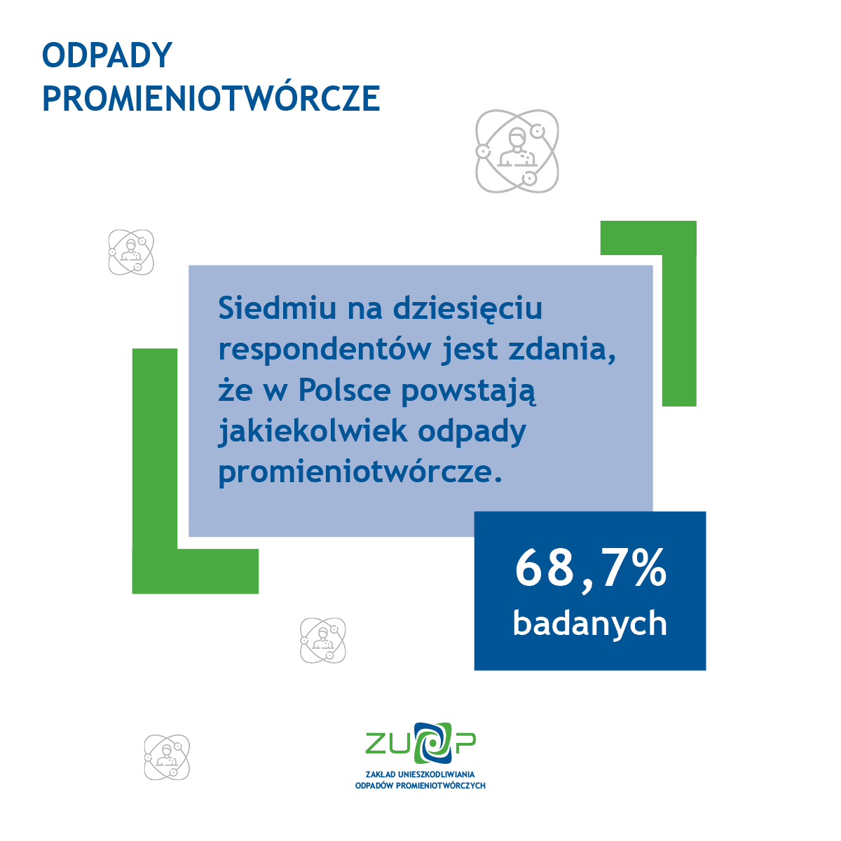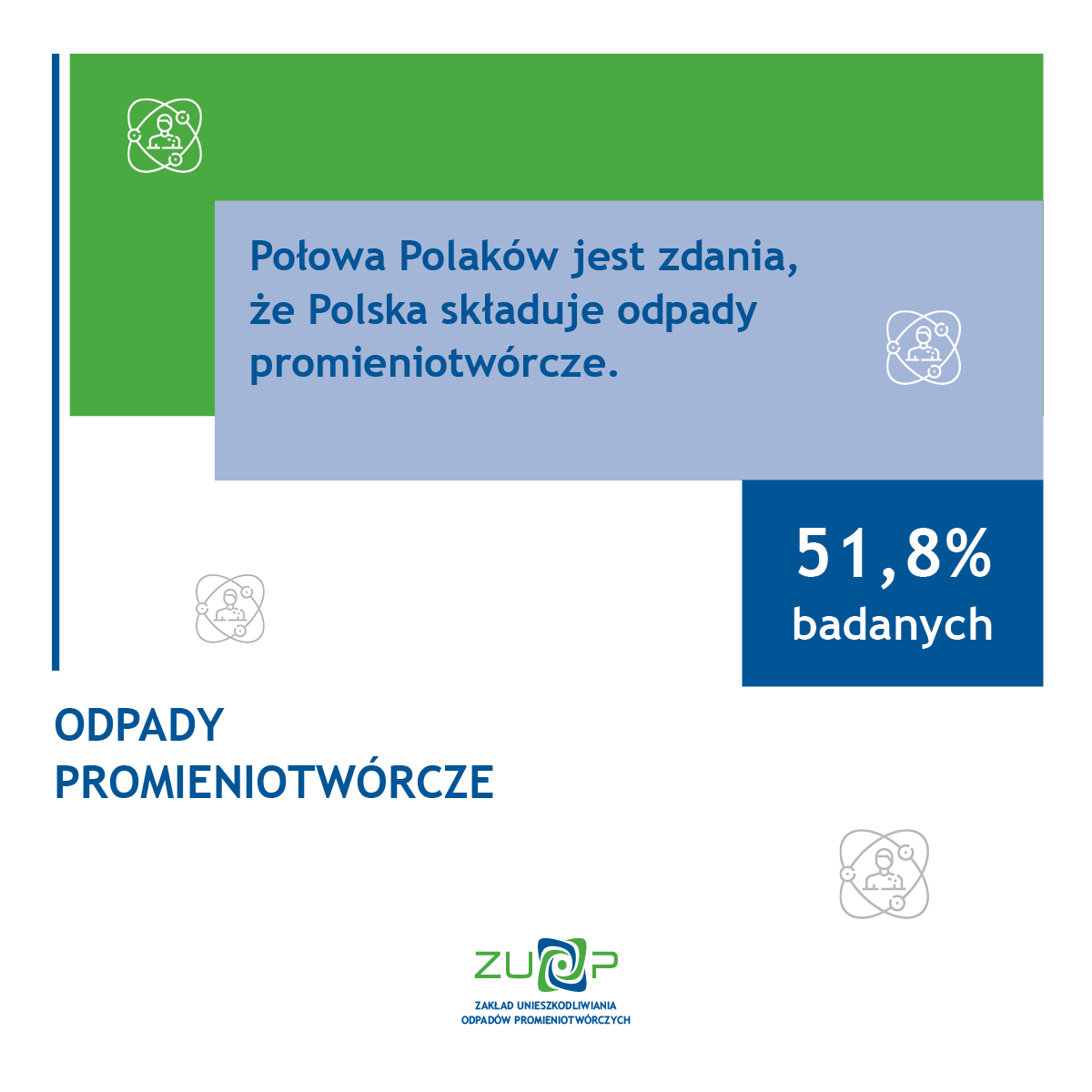 Jedynie 9,6 procent badanych słyszało o jakiejkolwiek instytucji odpowiedzialnej za unieszkodliwianie odpadów promieniotwórczych w Polsce. Wśród tych osób połowa znała i potrafiła wymienić Zakład Unieszkodliwiania Odpadów Promieniotwórczych. O działalności tych instytucji Polacy najczęściej dowiadują się z Internetu, telewizji lub pracy.