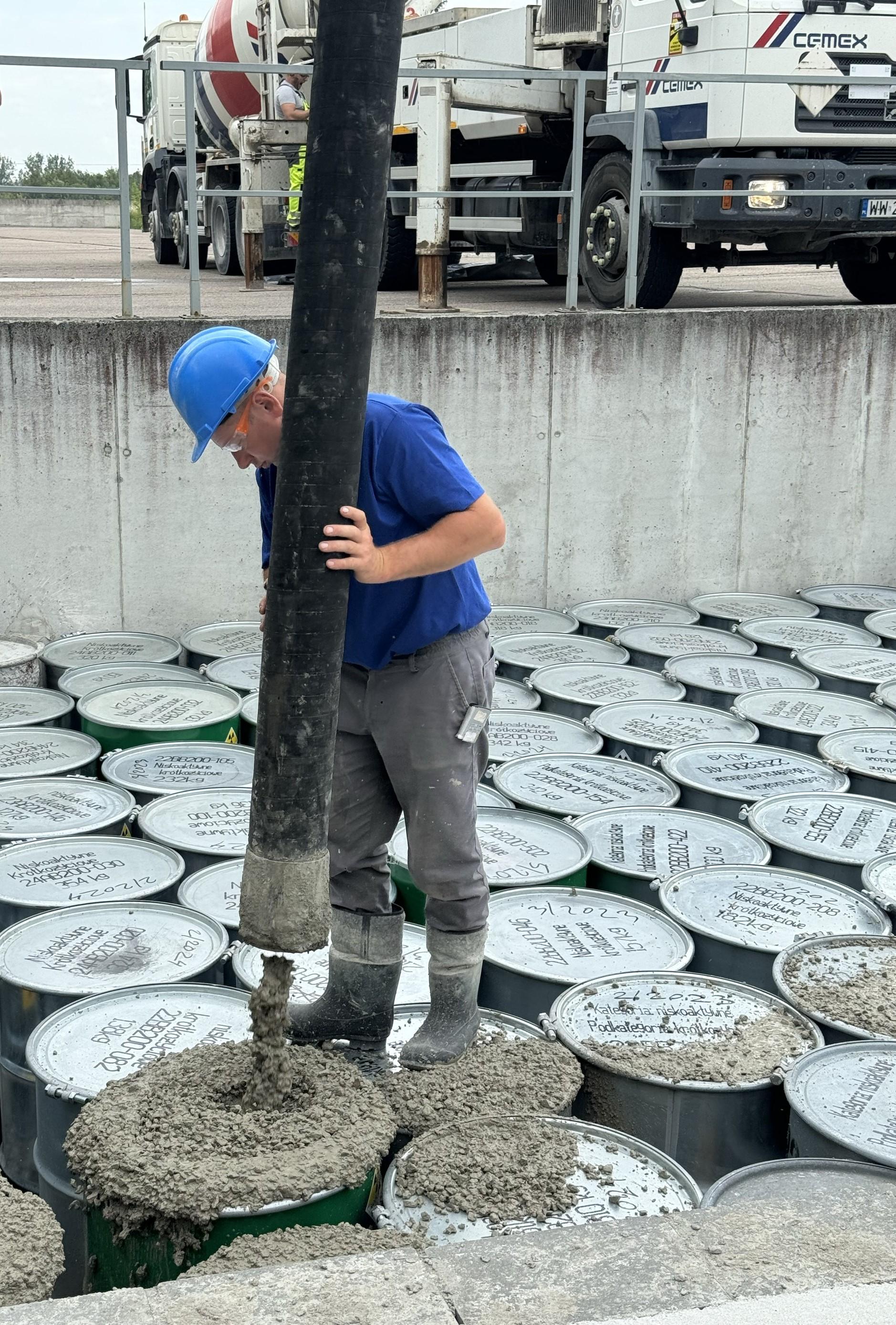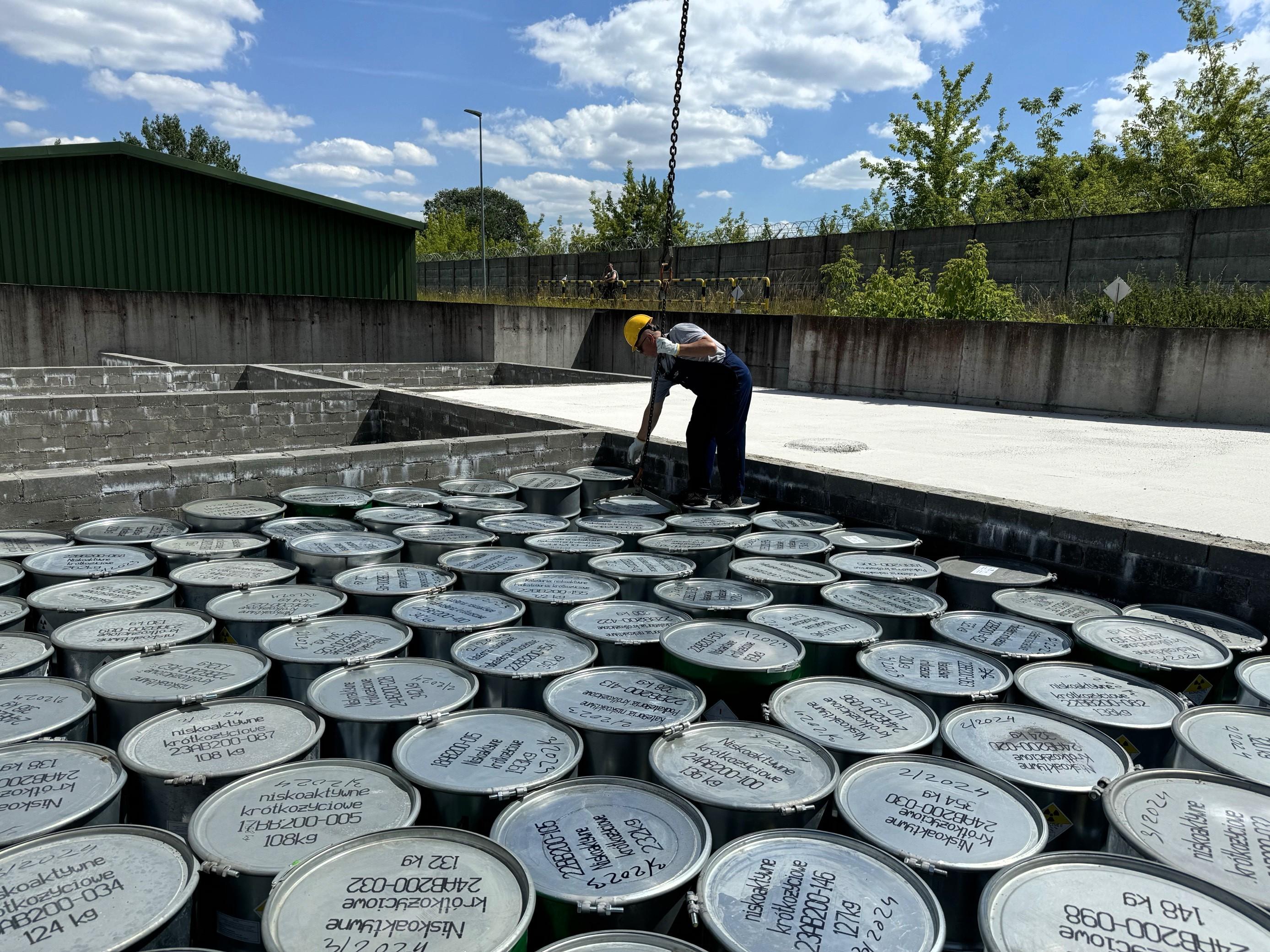 Pierwszy etap prac polegał na umieszczeniu stalowych bębnów z odpadami promieniotwórczymi w obiekcie nr 8. Bębny przy pomocy dźwigu ustawione zostały w wydzielonych boksach. Kolejnym etapem prac było zalanie bębnów betonem. Do tych prac używany jest beton klasy C30/37. Jest on stosowany w budownictwie przemysłowym i inżynieryjnym. Jego wytrzymałość pozwala budować z niego mosty, przepusty czy wiadukty.